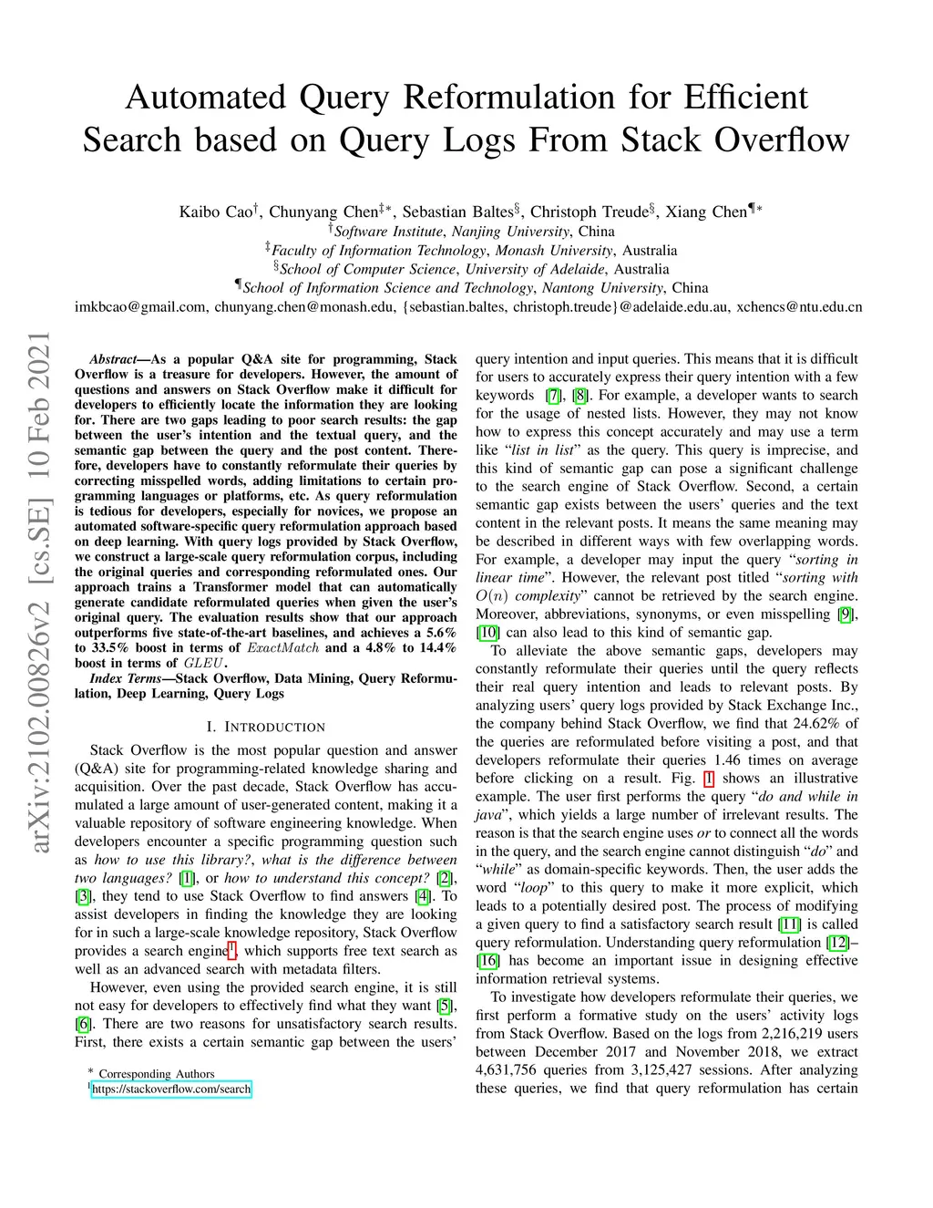 As a popular Q&A site for programming, Stack Overflow is a treasure for developers. However, the amount of questions and answers on Stack Overflow make it difficult for developers to efficiently locate the information they are looking for. There are two gaps leading to poor search results: the gap between the user's intention and the textual query, and the semantic gap between the query and the post content. Therefore, developers have to constantly reformulate their queries by correcting misspelled words, adding limitations to certain programming languages or platforms, etc. As query reformulation is tedious for developers, especially for novices, we propose an automated software-specific query reformulation approach based on deep learning. With query logs provided by Stack Overflow, we construct a large-scale query reformulation corpus, including the original queries and corresponding reformulated ones. Our approach trains a Transformer model that can automatically generate candidate reformulated queries when given the user's original query. The evaluation results show that our approach outperforms five state-of-the-art baselines, and achieves a 5.6% to 33.5% boost in terms of and a 4.8% to 14.4% boost in terms of .
