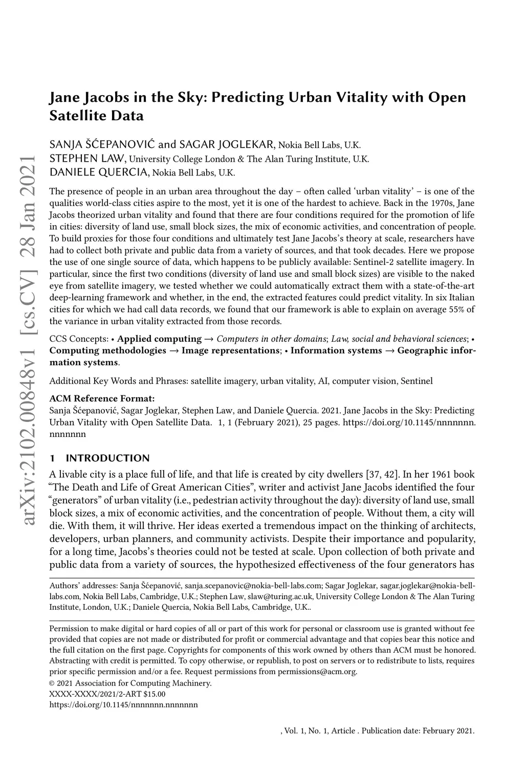 The presence of people in an urban area throughout the day -- often called úrban vitality' -- is one of the qualities world-class cities aspire to the most, yet it is one of the hardest to achieve. Back in the 1970s, Jane Jacobs theorized urban vitality and found that there are four conditions required for the promotion of life in cities: diversity of land use, small block sizes, the mix of economic activities, and concentration of people. To build proxies for those four conditions and ultimately test Jane Jacobs's theory at scale, researchers have had to collect both private and public data from a variety of sources, and that took decades. Here we propose the use of one single source of data, which happens to be publicly available: Sentinel-2 satellite imagery. In particular, since the first two conditions (diversity of land use and small block sizes) are visible to the naked eye from satellite imagery, we tested whether we could automatically extract them with a state-of-the-art deep-learning framework and whether, in the end, the extracted features could predict vitality. In six Italian cities for which we had call data records, we found that our framework is able to explain on average 55% of the variance in urban vitality extracted from those records.