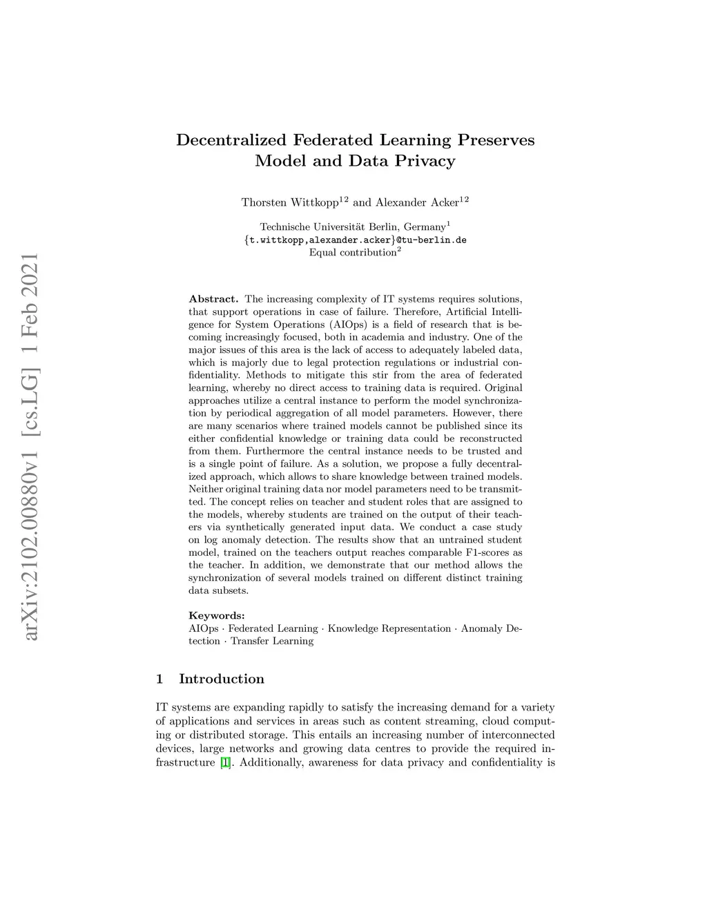 The increasing complexity of IT systems requires solutions, that support operations in case of failure. Therefore, Artificial Intelligence for System Operations (AIOps) is a field of research that is becoming increasingly focused, both in academia and industry. One of the major issues of this area is the lack of access to adequately labeled data, which is majorly due to legal protection regulations or industrial confidentiality. Methods to mitigate this stir from the area of federated learning, whereby no direct access to training data is required. Original approaches utilize a central instance to perform the model synchronization by periodical aggregation of all model parameters. However, there are many scenarios where trained models cannot be published since its either confidential knowledge or training data could be reconstructed from them. Furthermore the central instance needs to be trusted and is a single point of failure. As a solution, we propose a fully decentralized approach, which allows to share knowledge between trained models. Neither original training data nor model parameters need to be transmitted. The concept relies on teacher and student roles that are assigned to the models, whereby students are trained on the output of their teachers via synthetically generated input data. We conduct a case study on log anomaly detection. The results show that an untrained student model, trained on the teachers output reaches comparable F1-scores as the teacher. In addition, we demonstrate that our method allows the synchronization of several models trained on different distinct training data subsets.