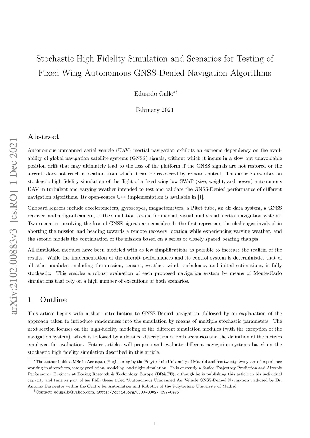 Autonomous unmanned aerial vehicle (UAV) inertial navigation exhibits an extreme dependency on the availability of global navigation satellite systems (GNSS) signals, without which it incurs in a slow but unavoidable position drift that may ultimately lead to the loss of the platform if the GNSS signals are not restored or the aircraft does not reach a location from which it can be recovered by remote control. This article describes an stochastic high fidelity simulation of the flight of a fixed wing low SWaP (size, weight, and power) autonomous UAV in turbulent and varying weather intended to test and validate the GNSS-Denied performance of different navigation algorithms. Its open-source \nm{\CC} implementation has been released and is publicly available. Onboard sensors include accelerometers, gyroscopes, magnetometers, a Pitot tube, an air data system, a GNSS receiver, and a digital camera, so the simulation is valid for inertial, visual, and visual inertial navigation systems. Two scenarios involving the loss of GNSS signals are considered: the first represents the challenges involved in aborting the mission and heading towards a remote recovery location while experiencing varying weather, and the second models the continuation of the mission based on a series of closely spaced bearing changes. All simulation modules have been modeled with as few simplifications as possible to increase the realism of the results. While the implementation of the aircraft performances and its control system is deterministic, that of all other modules, including the mission, sensors, weather, wind, turbulence, and initial estimations, is fully stochastic. This enables a robust evaluation of each proposed navigation system by means of Monte-Carlo simulations that rely on a high number of executions of both scenarios.