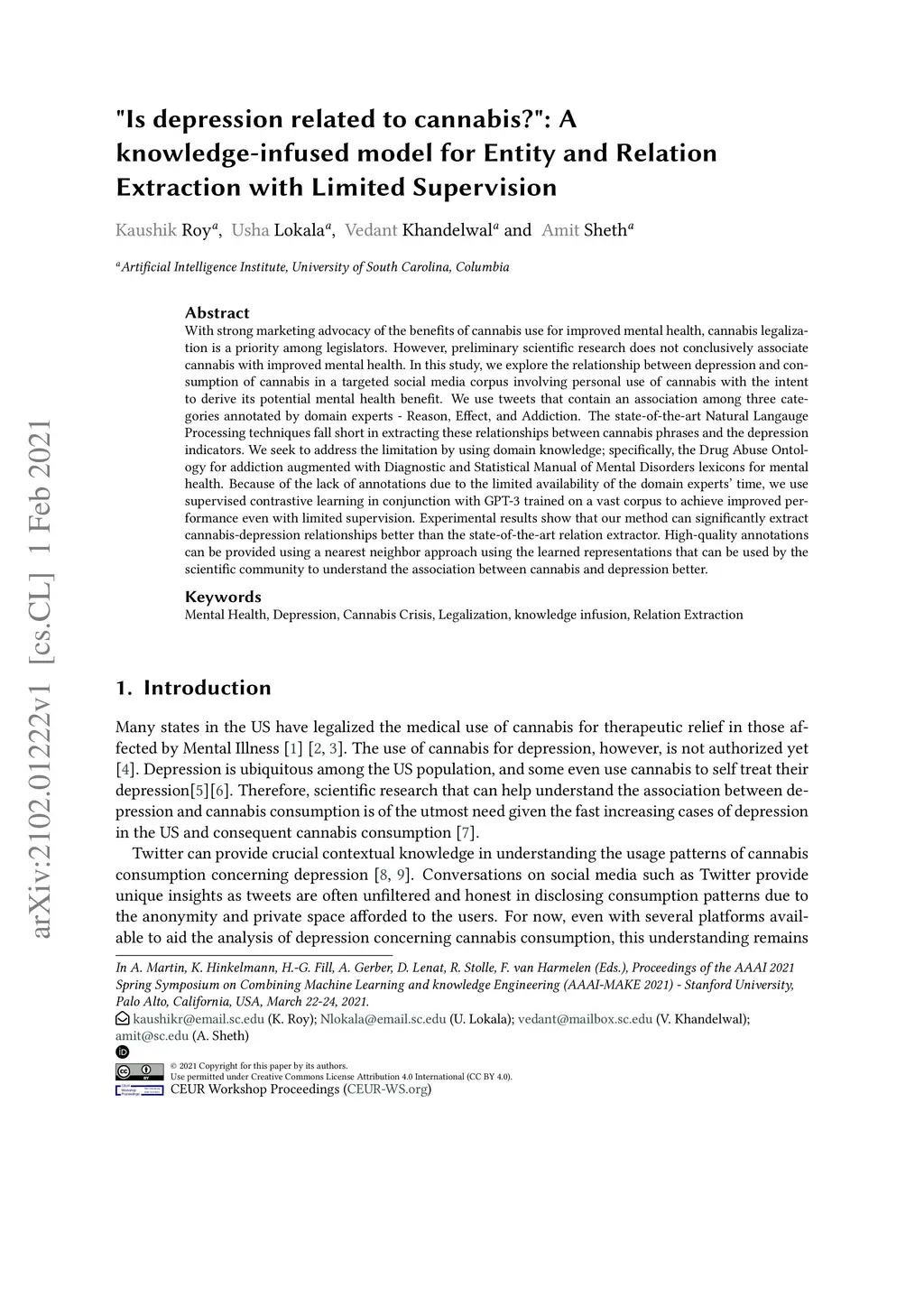 With strong marketing advocacy of the benefits of cannabis use for improved mental health, cannabis legalization is a priority among legislators. However, preliminary scientific research does not conclusively associate cannabis with improved mental health. In this study, we explore the relationship between depression and consumption of cannabis in a targeted social media corpus involving personal use of cannabis with the intent to derive its potential mental health benefit. We use tweets that contain an association among three categories annotated by domain experts - Reason, Effect, and Addiction. The state-of-the-art Natural Langauge Processing techniques fall short in extracting these relationships between cannabis phrases and the depression indicators. We seek to address the limitation by using domain knowledge; specifically, the Drug Abuse Ontology for addiction augmented with Diagnostic and Statistical Manual of Mental Disorders lexicons for mental health. Because of the lack of annotations due to the limited availability of the domain experts' time, we use supervised contrastive learning in conjunction with GPT-3 trained on a vast corpus to achieve improved performance even with limited supervision. Experimental results show that our method can significantly extract cannabis-depression relationships better than the state-of-the-art relation extractor. High-quality annotations can be provided using a nearest neighbor approach using the learned representations that can be used by the scientific community to understand the association between cannabis and depression better.