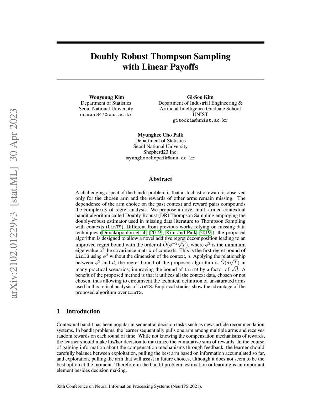 A challenging aspect of the bandit problem is that a stochastic reward is observed only for the chosen arm and the rewards of other arms remain missing. The dependence of the arm choice on the past context and reward pairs compounds the complexity of regret analysis. We propose a novel multi-armed contextual bandit algorithm called Doubly Robust (DR) Thompson Sampling employing the doubly-robust estimator used in missing data literature to Thompson Sampling with contexts (\texttt{LinTS}). Different from previous works relying on missing data techniques (\citet{dimakopoulou2019balanced}, \citet{kim2019doubly}), the proposed algorithm is designed to allow a novel additive regret decomposition leading to an improved regret bound with the order of , where is the minimum eigenvalue of the covariance matrix of contexts. This is the first regret bound of \texttt{LinTS} using without the dimension of the context, . Applying the relationship between and , the regret bound of the proposed algorithm is in many practical scenarios, improving the bound of \texttt{LinTS} by a factor of . A benefit of the proposed method is that it utilizes all the context data, chosen or not chosen, thus allowing to circumvent the technical definition of unsaturated arms used in theoretical analysis of \texttt{LinTS}. Empirical studies show the advantage of the proposed algorithm over \texttt{LinTS}.
