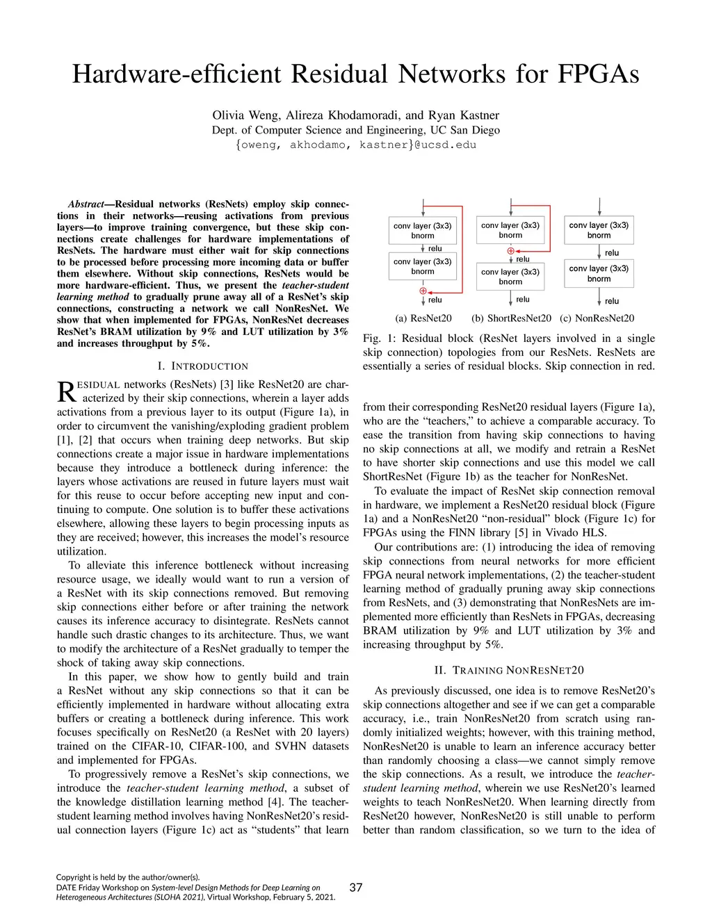 Residual networks (ResNets) employ skip connections in their networks -- reusing activations from previous layers -- to improve training convergence, but these skip connections create challenges for hardware implementations of ResNets. The hardware must either wait for skip connections to be processed before processing more incoming data or buffer them elsewhere. Without skip connections, ResNets would be more hardware-efficient. Thus, we present the teacher-student learning method to gradually prune away all of a ResNet's skip connections, constructing a network we call NonResNet. We show that when implemented for FPGAs, NonResNet decreases ResNet's BRAM utilization by 9% and LUT utilization by 3% and increases throughput by 5%.