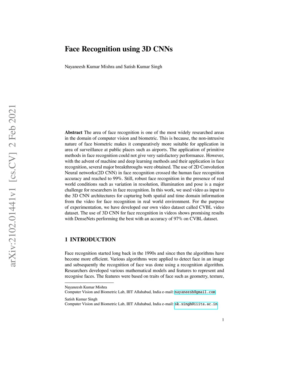 The area of face recognition is one of the most widely researched areas in the domain of computer vision and biometric. This is because, the non-intrusive nature of face biometric makes it comparatively more suitable for application in area of surveillance at public places such as airports. The application of primitive methods in face recognition could not give very satisfactory performance. However, with the advent of machine and deep learning methods and their application in face recognition, several major breakthroughs were obtained. The use of 2D Convolution Neural networks(2D CNN) in face recognition crossed the human face recognition accuracy and reached to 99%. Still, robust face recognition in the presence of real world conditions such as variation in resolution, illumination and pose is a major challenge for researchers in face recognition. In this work, we used video as input to the 3D CNN architectures for capturing both spatial and time domain information from the video for face recognition in real world environment. For the purpose of experimentation, we have developed our own video dataset called CVBL video dataset. The use of 3D CNN for face recognition in videos shows promising results with DenseNets performing the best with an accuracy of 97% on CVBL dataset.
