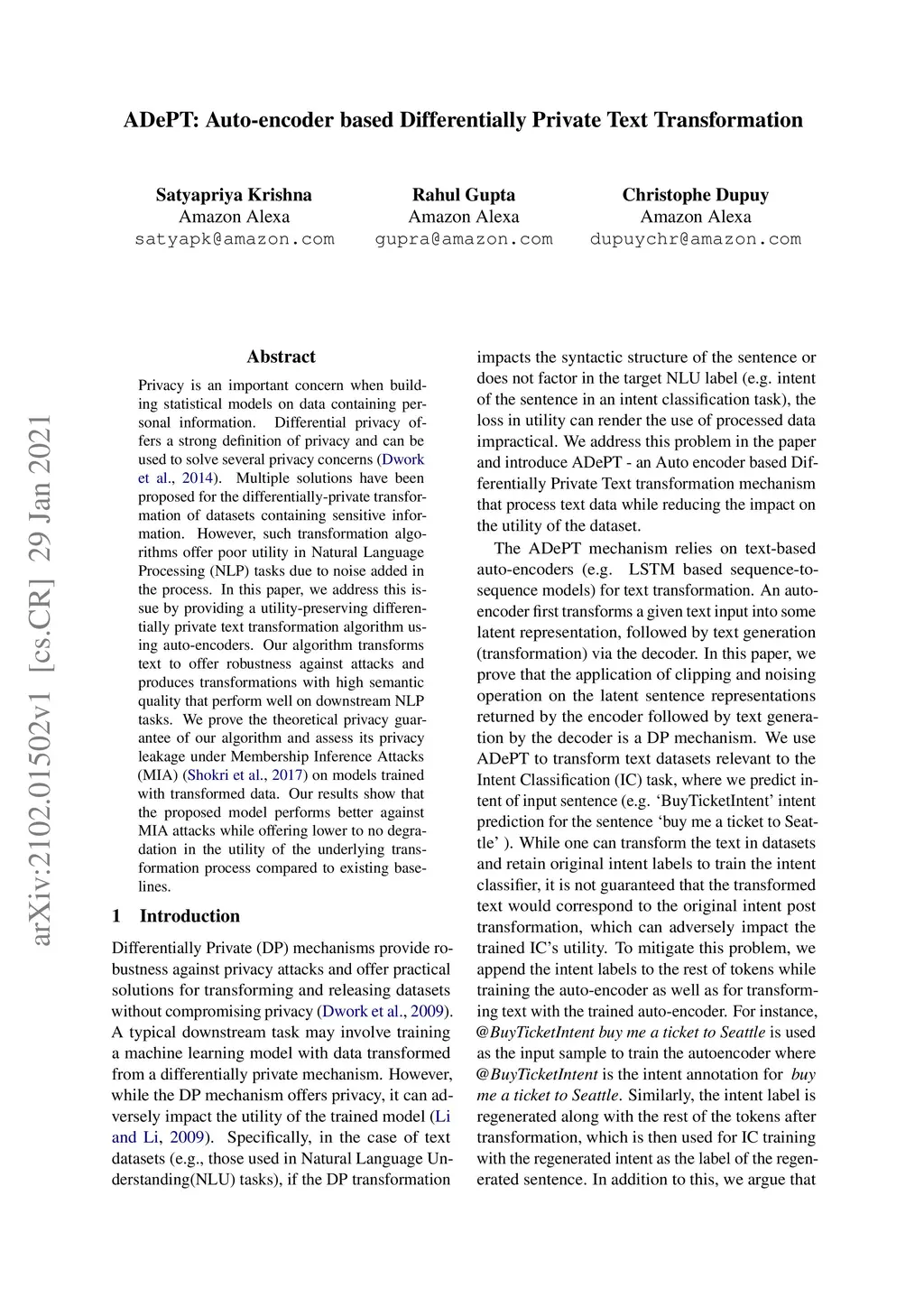 ADePT: Auto-encoder based Differentially Private Text Transformation