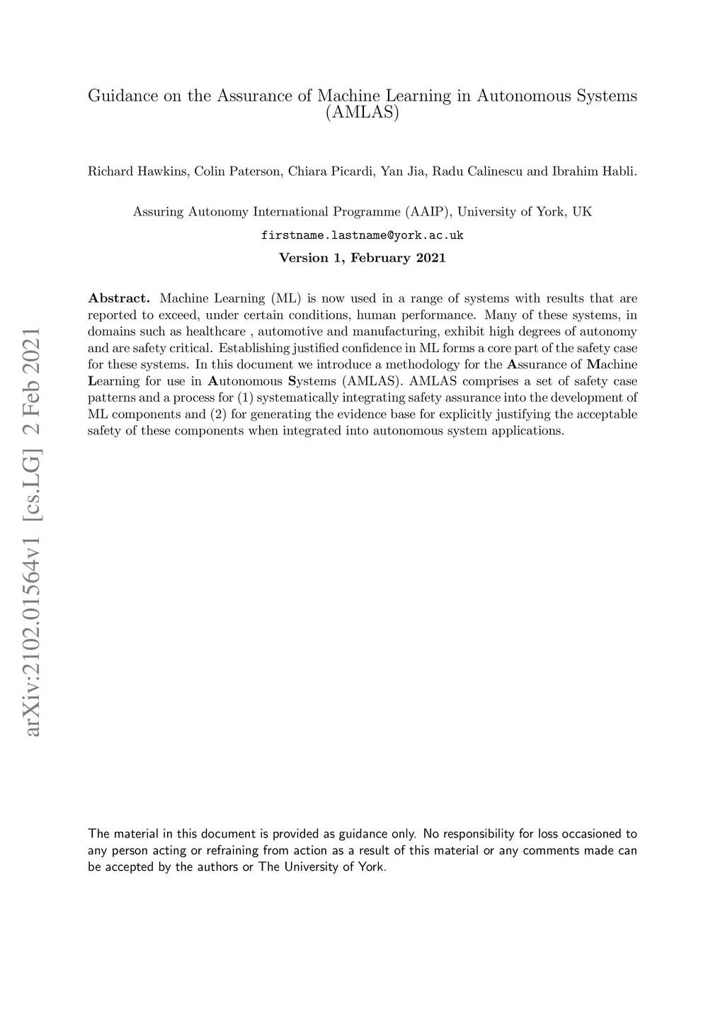 Machine Learning (ML) is now used in a range of systems with results that are reported to exceed, under certain conditions, human performance. Many of these systems, in domains such as healthcare , automotive and manufacturing, exhibit high degrees of autonomy and are safety critical. Establishing justified confidence in ML forms a core part of the safety case for these systems. In this document we introduce a methodology for the Assurance of Machine Learning for use in Autonomous Systems (AMLAS). AMLAS comprises a set of safety case patterns and a process for (1) systematically integrating safety assurance into the development of ML components and (2) for generating the evidence base for explicitly justifying the acceptable safety of these components when integrated into autonomous system applications.
