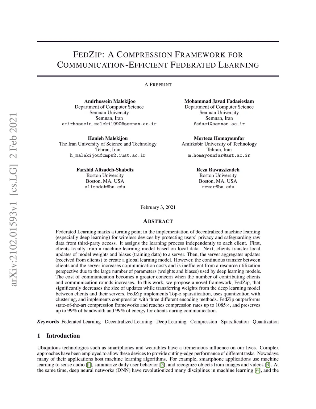 Federated Learning marks a turning point in the implementation of decentralized machine learning (especially deep learning) for wireless devices by protecting users' privacy and safeguarding raw data from third-party access. It assigns the learning process independently to each client. First, clients locally train a machine learning model based on local data. Next, clients transfer local updates of model weights and biases (training data) to a server. Then, the server aggregates updates (received from clients) to create a global learning model. However, the continuous transfer between clients and the server increases communication costs and is inefficient from a resource utilization perspective due to the large number of parameters (weights and biases) used by deep learning models. The cost of communication becomes a greater concern when the number of contributing clients and communication rounds increases. In this work, we propose a novel framework, FedZip, that significantly decreases the size of updates while transferring weights from the deep learning model between clients and their servers. FedZip implements Top-z sparsification, uses quantization with clustering, and implements compression with three different encoding methods. FedZip outperforms state-of-the-art compression frameworks and reaches compression rates up to 1085x, and preserves up to 99% of bandwidth and 99% of energy for clients during communication.