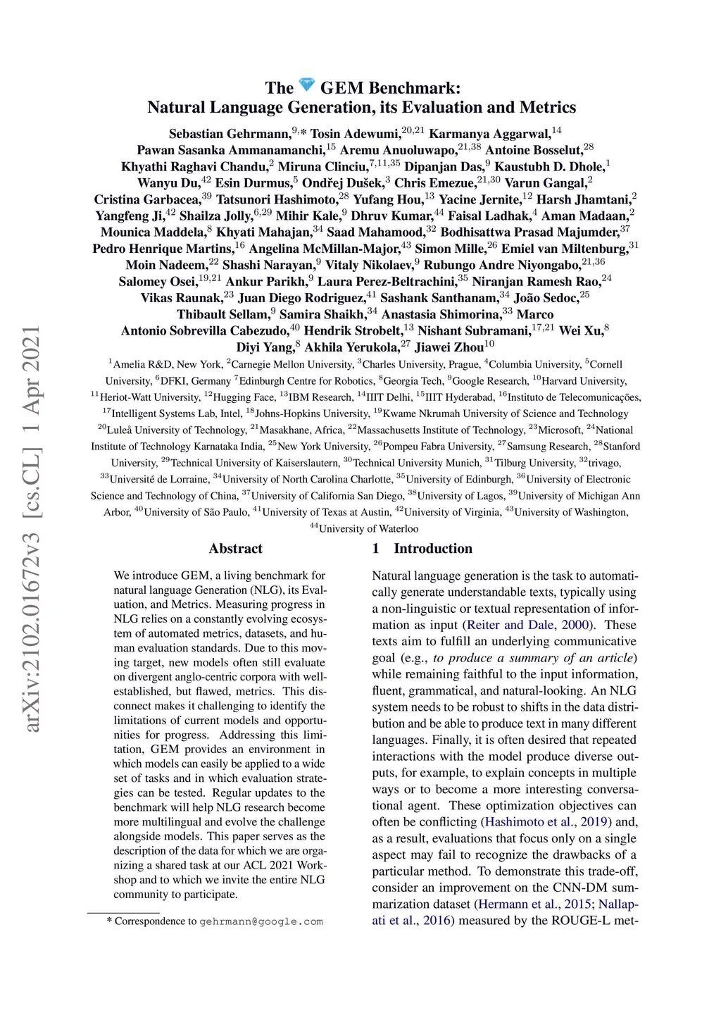 We introduce GEM, a living benchmark for natural language Generation (NLG), its Evaluation, and Metrics. Measuring progress in NLG relies on a constantly evolving ecosystem of automated metrics, datasets, and human evaluation standards. Due to this moving target, new models often still evaluate on divergent anglo-centric corpora with well-established, but flawed, metrics. This disconnect makes it challenging to identify the limitations of current models and opportunities for progress. Addressing this limitation, GEM provides an environment in which models can easily be applied to a wide set of tasks and in which evaluation strategies can be tested. Regular updates to the benchmark will help NLG research become more multilingual and evolve the challenge alongside models. This paper serves as the description of the data for which we are organizing a shared task at our ACL 2021 Workshop and to which we invite the entire NLG community to participate.