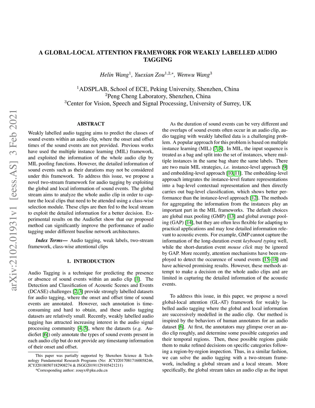 A Global-local Attention Framework for Weakly Labelled Audio Tagging