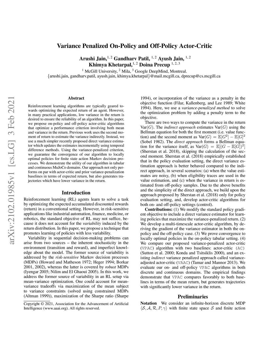 Variance Penalized On-Policy and Off-Policy Actor-Critic