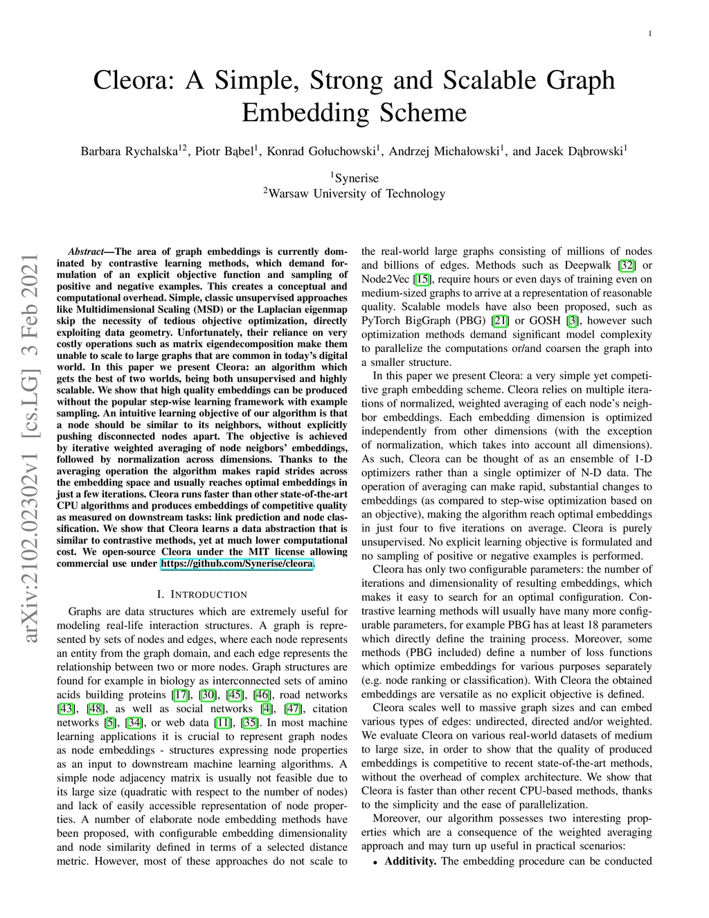 The area of graph embeddings is currently dominated by contrastive learning methods, which demand formulation of an explicit objective function and sampling of positive and negative examples. This creates a conceptual and computational overhead. Simple, classic unsupervised approaches like Multidimensional Scaling (MSD) or the Laplacian eigenmap skip the necessity of tedious objective optimization, directly exploiting data geometry. Unfortunately, their reliance on very costly operations such as matrix eigendecomposition make them unable to scale to large graphs that are common in today's digital world. In this paper we present Cleora: an algorithm which gets the best of two worlds, being both unsupervised and highly scalable. We show that high quality embeddings can be produced without the popular step-wise learning framework with example sampling. An intuitive learning objective of our algorithm is that a node should be similar to its neighbors, without explicitly pushing disconnected nodes apart. The objective is achieved by iterative weighted averaging of node neigbors' embeddings, followed by normalization across dimensions. Thanks to the averaging operation the algorithm makes rapid strides across the embedding space and usually reaches optimal embeddings in just a few iterations. Cleora runs faster than other state-of-the-art CPU algorithms and produces embeddings of competitive quality as measured on downstream tasks: link prediction and node classification. We show that Cleora learns a data abstraction that is similar to contrastive methods, yet at much lower computational cost. We open-source Cleora under the MIT license allowing commercial use under https://github.com/Synerise/cleora.