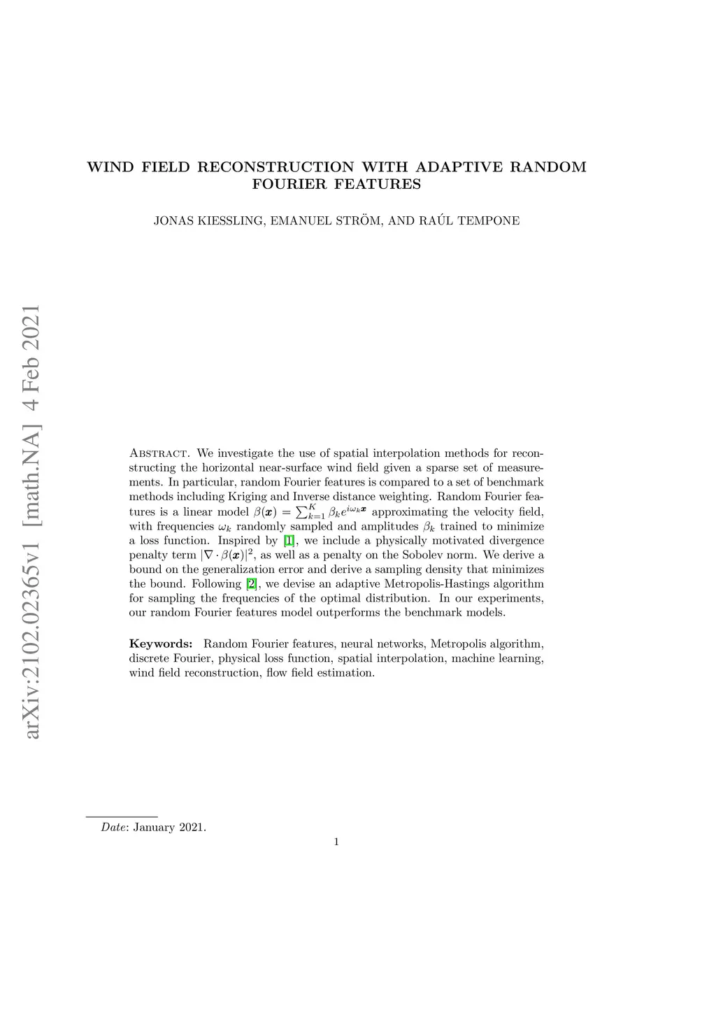We investigate the use of spatial interpolation methods for reconstructing the horizontal near-surface wind field given a sparse set of measurements. In particular, random Fourier features is compared to a set of benchmark methods including Kriging and Inverse distance weighting. Random Fourier features is a linear model approximating the velocity field, with frequencies randomly sampled and amplitudes trained to minimize a loss function. We include a physically motivated divergence penalty term , as well as a penalty on the Sobolev norm. We derive a bound on the generalization error and derive a sampling density that minimizes the bound. Following (arXiv:2007.10683 [math.NA]), we devise an adaptive Metropolis-Hastings algorithm for sampling the frequencies of the optimal distribution. In our experiments, our random Fourier features model outperforms the benchmark models.