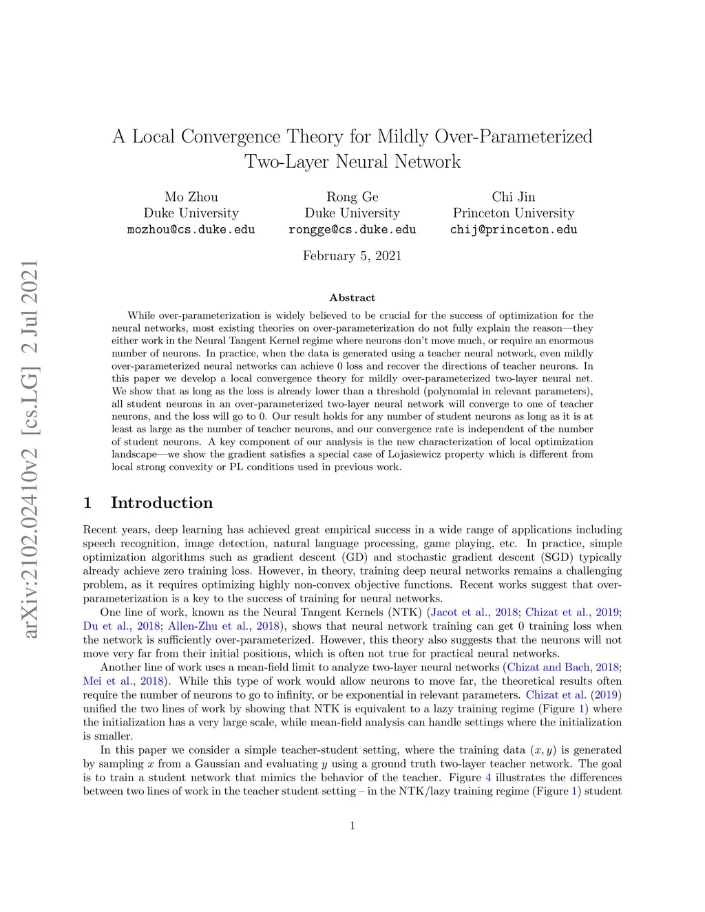 While over-parameterization is widely believed to be crucial for the success of optimization for the neural networks, most existing theories on over-parameterization do not fully explain the reason -- they either work in the Neural Tangent Kernel regime where neurons don't move much, or require an enormous number of neurons. In practice, when the data is generated using a teacher neural network, even mildly over-parameterized neural networks can achieve 0 loss and recover the directions of teacher neurons. In this paper we develop a local convergence theory for mildly over-parameterized two-layer neural net. We show that as long as the loss is already lower than a threshold (polynomial in relevant parameters), all student neurons in an over-parameterized two-layer neural network will converge to one of teacher neurons, and the loss will go to 0. Our result holds for any number of student neurons as long as it is at least as large as the number of teacher neurons, and our convergence rate is independent of the number of student neurons. A key component of our analysis is the new characterization of local optimization landscape -- we show the gradient satisfies a special case of Lojasiewicz property which is different from local strong convexity or PL conditions used in previous work.