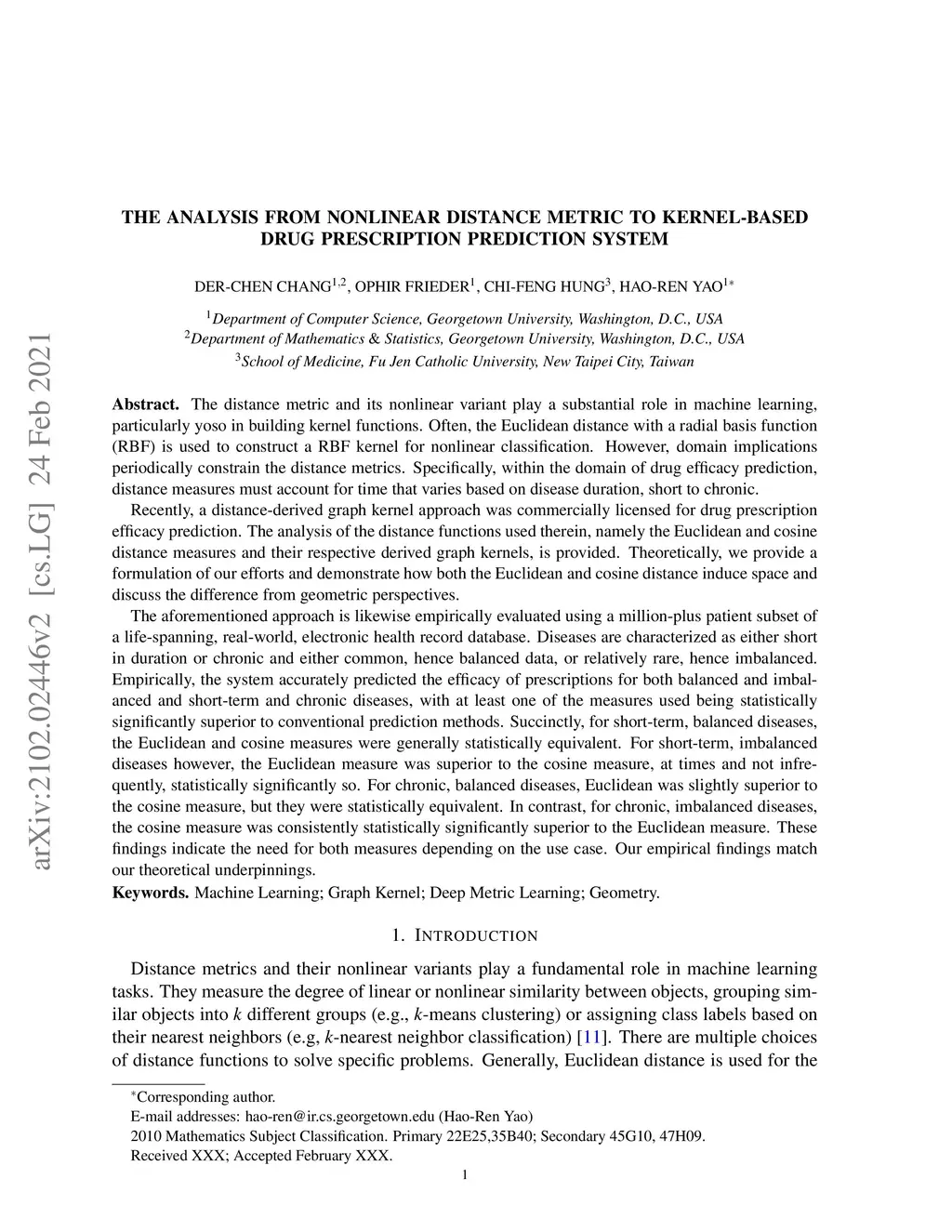 Distance metrics and their nonlinear variant play a crucial role in machine learning based real-world problem solving. We demonstrated how Euclidean and cosine distance measures differ not only theoretically but also in real-world medical application, namely, outcome prediction of drug prescription. Euclidean distance exhibits favorable properties in the local geometry problem. To this regard, Euclidean distance can be applied under short-term disease with low-variation outcome observation. Moreover, when presenting to highly variant chronic disease, it is preferable to use cosine distance. These different geometric properties lead to different submanifolds in the original embedded space, and hence, to different optimizing nonlinear kernel embedding frameworks. We first established the geometric properties that we needed in these frameworks. From these properties interpreted their differences in certain perspectives. Our evaluation on real-world, large-scale electronic health records and embedding space visualization empirically validated our approach.