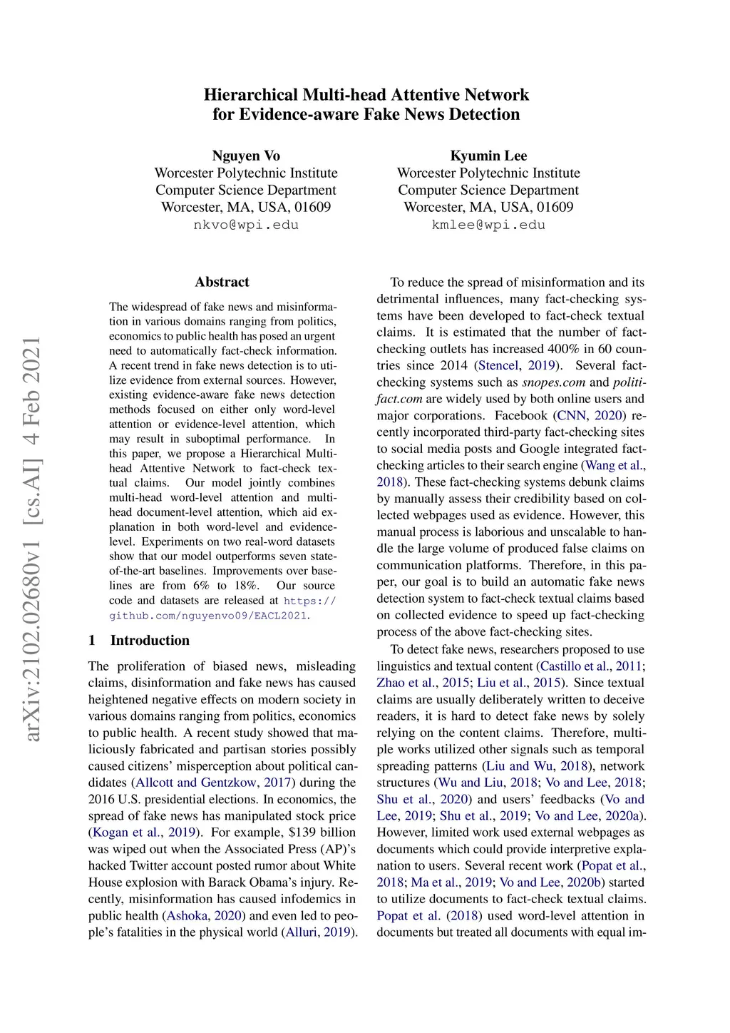 The widespread of fake news and misinformation in various domains ranging from politics, economics to public health has posed an urgent need to automatically fact-check information. A recent trend in fake news detection is to utilize evidence from external sources. However, existing evidence-aware fake news detection methods focused on either only word-level attention or evidence-level attention, which may result in suboptimal performance. In this paper, we propose a Hierarchical Multi-head Attentive Network to fact-check textual claims. Our model jointly combines multi-head word-level attention and multi-head document-level attention, which aid explanation in both word-level and evidence-level. Experiments on two real-word datasets show that our model outperforms seven state-of-the-art baselines. Improvements over baselines are from 6\% to 18\%. Our source code and datasets are released at \texttt{\url{https://github.com/nguyenvo09/EACL2021}}.