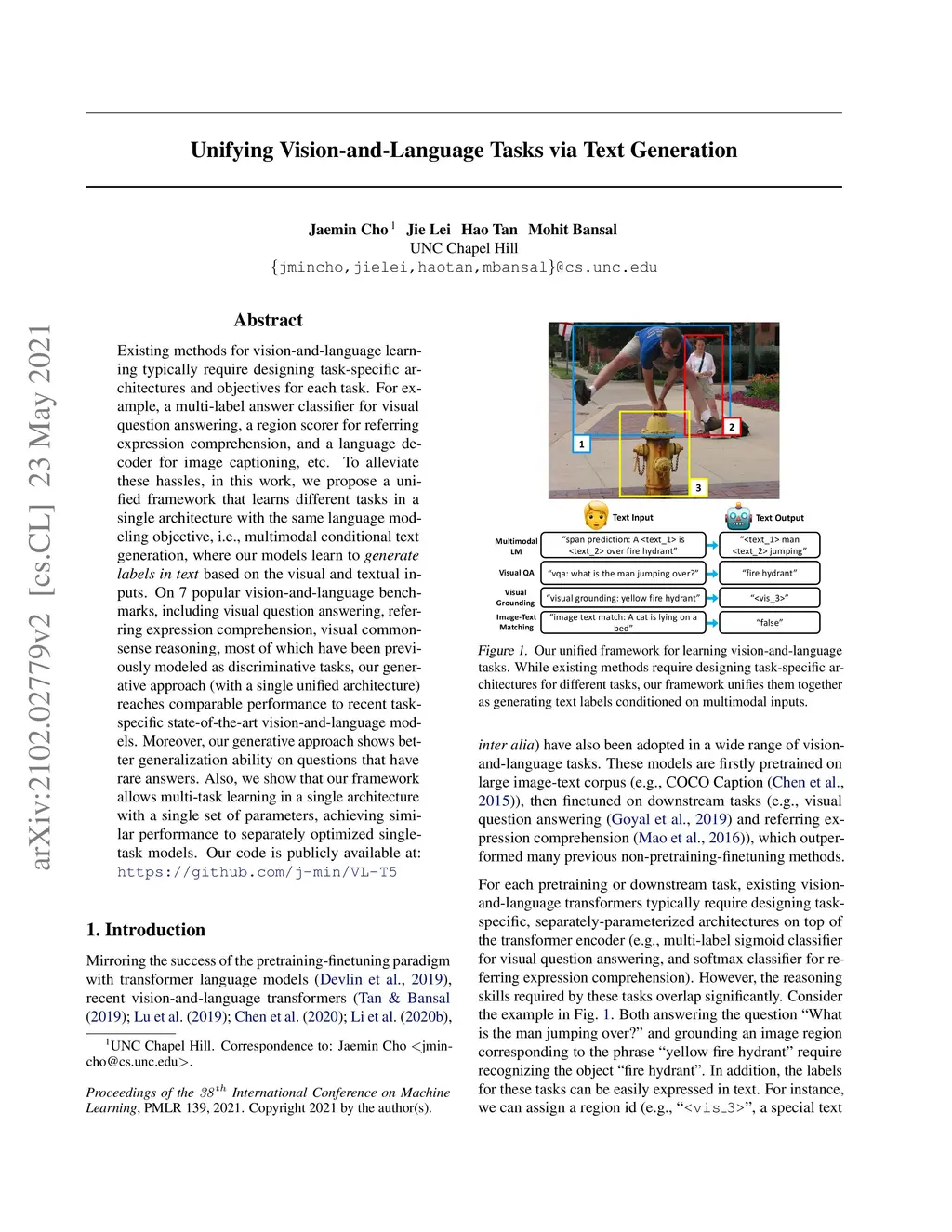 Existing methods for vision-and-language learning typically require designing task-specific architectures and objectives for each task. For example, a multi-label answer classifier for visual question answering, a region scorer for referring expression comprehension, and a language decoder for image captioning, etc. To alleviate these hassles, in this work, we propose a unified framework that learns different tasks in a single architecture with the same language modeling objective, i.e., multimodal conditional text generation, where our models learn to generate labels in text based on the visual and textual inputs. On 7 popular vision-and-language benchmarks, including visual question answering, referring expression comprehension, visual commonsense reasoning, most of which have been previously modeled as discriminative tasks, our generative approach (with a single unified architecture) reaches comparable performance to recent task-specific state-of-the-art vision-and-language models. Moreover, our generative approach shows better generalization ability on questions that have rare answers. Also, we show that our framework allows multi-task learning in a single architecture with a single set of parameters, achieving similar performance to separately optimized single-task models. Our code is publicly available at: https://github.com/j-min/VL-T5