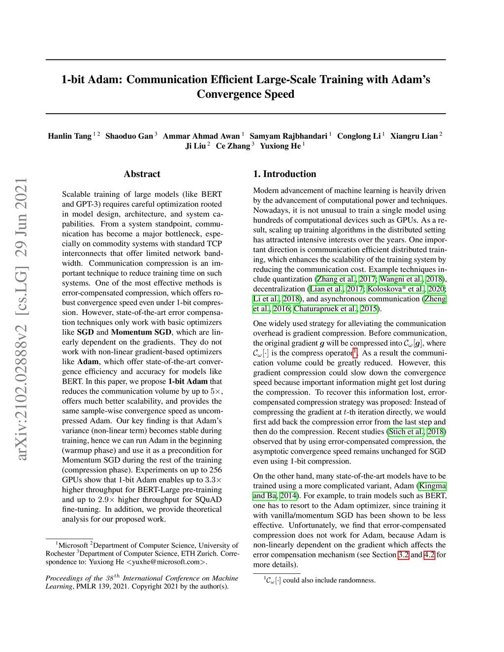 1-bit Adam: Communication Efficient Large-Scale Training with Adam's Convergence Speed