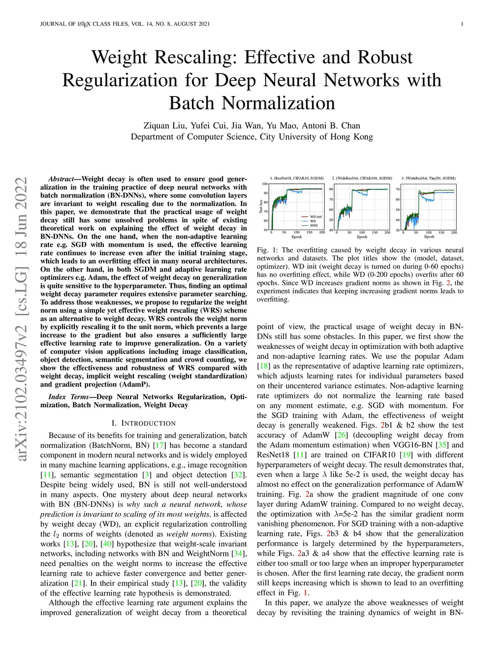 Weight decay is often used to ensure good generalization in the training practice of deep neural networks with batch normalization (BN-DNNs), where some convolution layers are invariant to weight rescaling due to the normalization. In this paper, we demonstrate that the practical usage of weight decay still has some unsolved problems in spite of existing theoretical work on explaining the effect of weight decay in BN-DNNs. On the one hand, when the non-adaptive learning rate e.g. SGD with momentum is used, the effective learning rate continues to increase even after the initial training stage, which leads to an overfitting effect in many neural architectures. On the other hand, in both SGDM and adaptive learning rate optimizers e.g. Adam, the effect of weight decay on generalization is quite sensitive to the hyperparameter. Thus, finding an optimal weight decay parameter requires extensive parameter searching. To address those weaknesses, we propose to regularize the weight norm using a simple yet effective weight rescaling (WRS) scheme as an alternative to weight decay. WRS controls the weight norm by explicitly rescaling it to the unit norm, which prevents a large increase to the gradient but also ensures a sufficiently large effective learning rate to improve generalization. On a variety of computer vision applications including image classification, object detection, semantic segmentation and crowd counting, we show the effectiveness and robustness of WRS compared with weight decay, implicit weight rescaling (weight standardization) and gradient projection (AdamP).