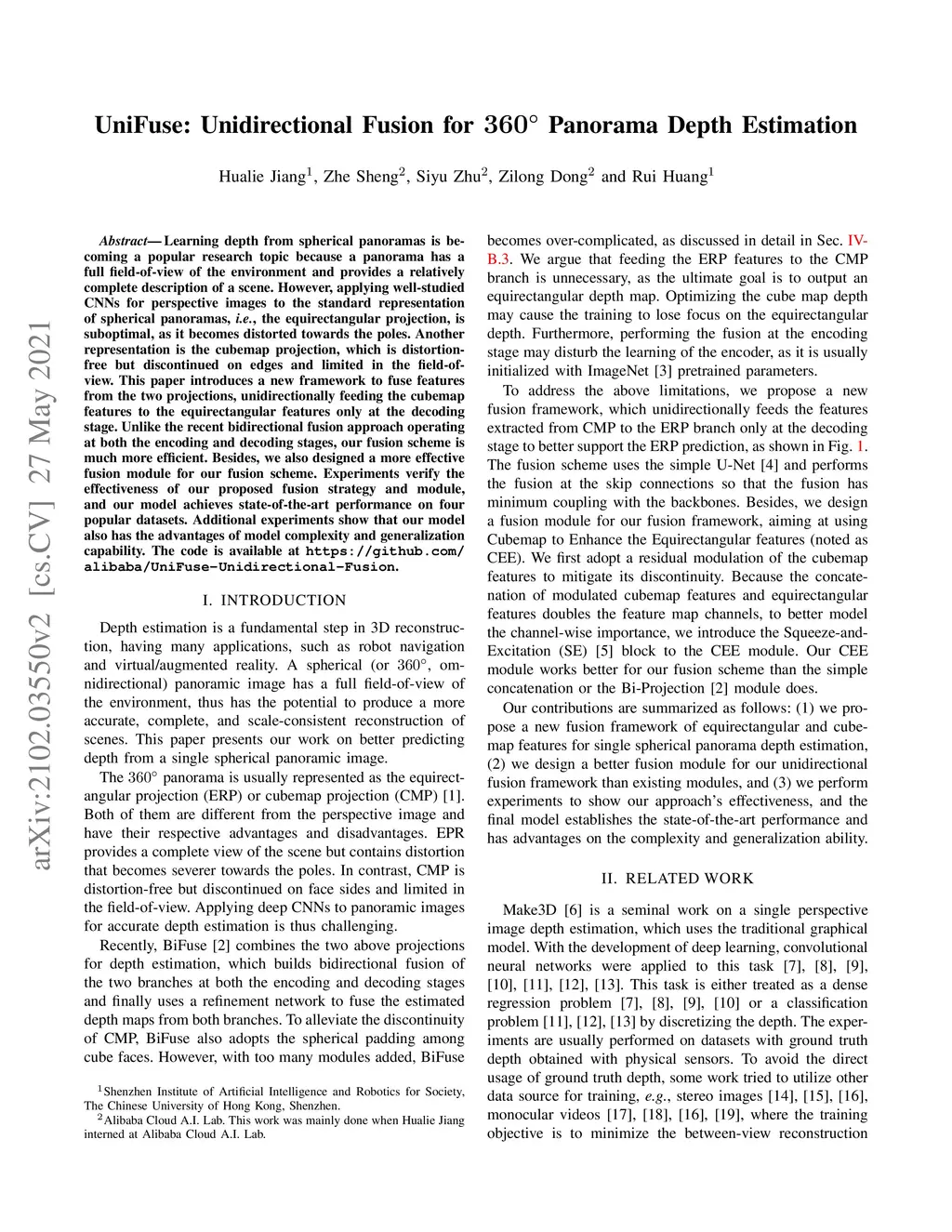UniFuse: Unidirectional Fusion for 360 Panorama Depth