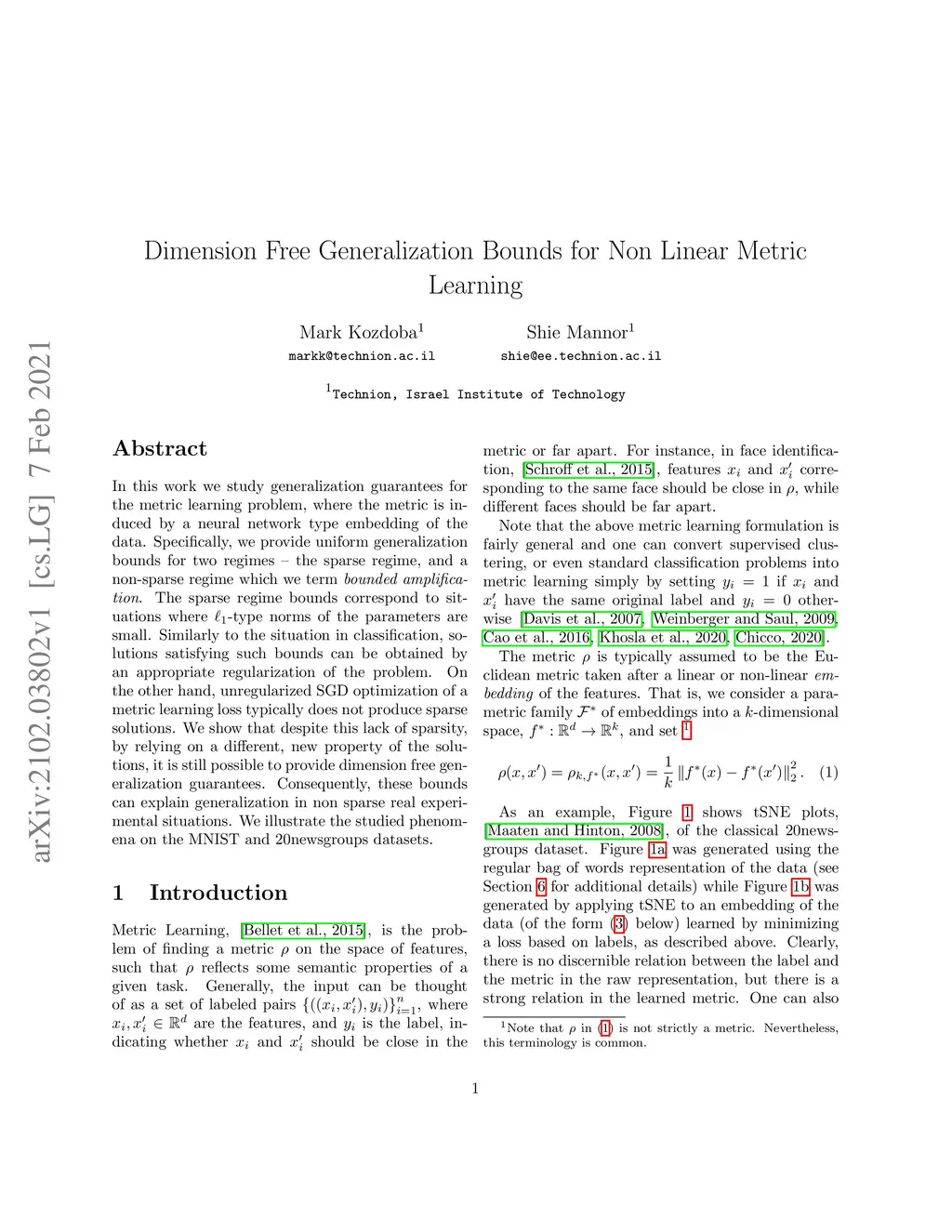In this work we study generalization guarantees for the metric learning problem, where the metric is induced by a neural network type embedding of the data. Specifically, we provide uniform generalization bounds for two regimes -- the sparse regime, and a non-sparse regime which we term \emph{bounded amplification}. The sparse regime bounds correspond to situations where -type norms of the parameters are small. Similarly to the situation in classification, solutions satisfying such bounds can be obtained by an appropriate regularization of the problem. On the other hand, unregularized SGD optimization of a metric learning loss typically does not produce sparse solutions. We show that despite this lack of sparsity, by relying on a different, new property of the solutions, it is still possible to provide dimension free generalization guarantees. Consequently, these bounds can explain generalization in non sparse real experimental situations. We illustrate the studied phenomena on the MNIST and 20newsgroups datasets.