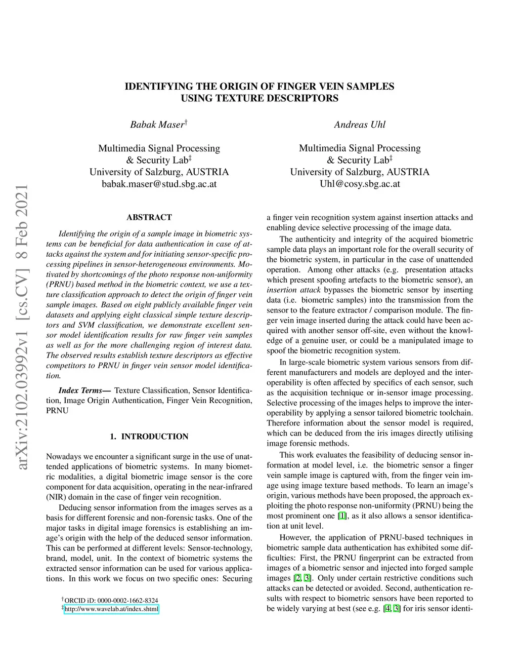 Identifying the Origin of Finger Vein Samples Using Texture Descriptors
