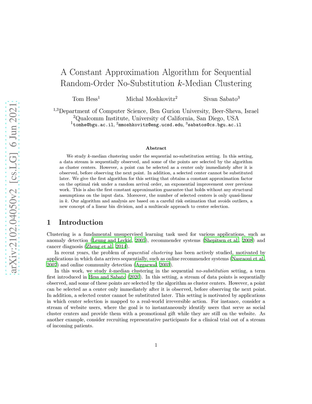 We study k-median clustering under the sequential no-substitution setting. In this setting, a data stream is sequentially observed, and some of the points are selected by the algorithm as cluster centers. However, a point can be selected as a center only immediately after it is observed, before observing the next point. In addition, a selected center cannot be substituted later. We give the first algorithm for this setting that obtains a constant approximation factor on the optimal risk under a random arrival order, an exponential improvement over previous work. This is also the first constant approximation guarantee that holds without any structural assumptions on the input data. Moreover, the number of selected centers is only quasi-linear in k. Our algorithm and analysis are based on a careful risk estimation that avoids outliers, a new concept of a linear bin division, and a multiscale approach to center selection.