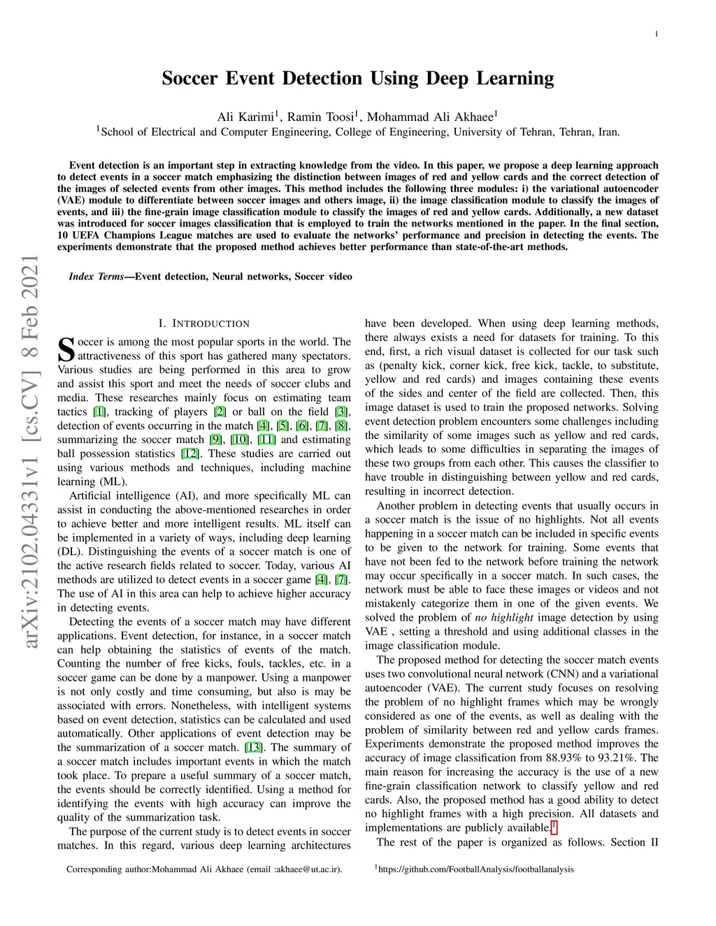 Event detection is an important step in extracting knowledge from the video. In this paper, we propose a deep learning approach to detect events in a soccer match emphasizing the distinction between images of red and yellow cards and the correct detection of the images of selected events from other images. This method includes the following three modules: i) the variational autoencoder (VAE) module to differentiate between soccer images and others image, ii) the image classification module to classify the images of events, and iii) the fine-grain image classification module to classify the images of red and yellow cards. Additionally, a new dataset was introduced for soccer images classification that is employed to train the networks mentioned in the paper. In the final section, 10 UEFA Champions League matches are used to evaluate the networks' performance and precision in detecting the events. The experiments demonstrate that the proposed method achieves better performance than state-of-the-art methods.