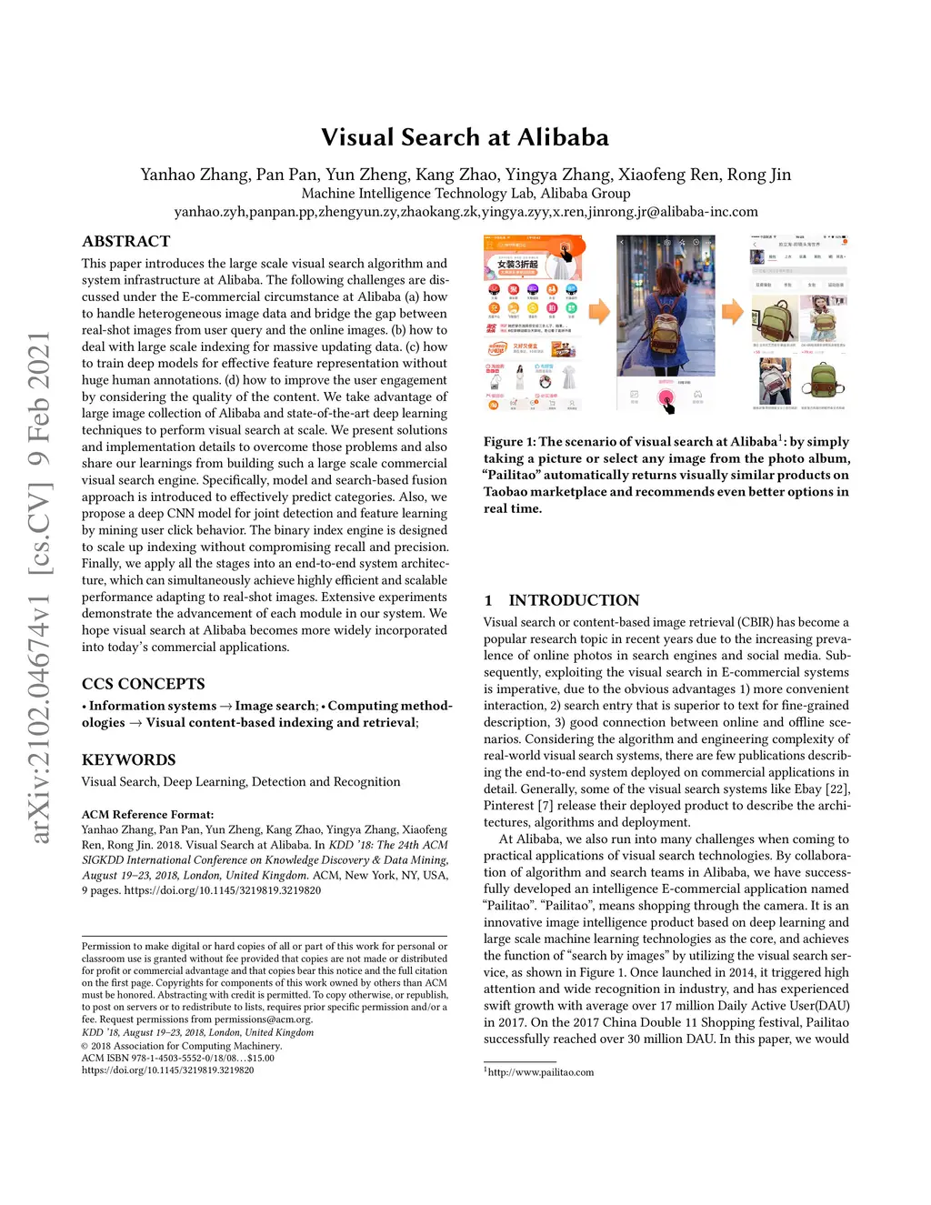 This paper introduces the large scale visual search algorithm and system infrastructure at Alibaba. The following challenges are discussed under the E-commercial circumstance at Alibaba (a) how to handle heterogeneous image data and bridge the gap between real-shot images from user query and the online images. (b) how to deal with large scale indexing for massive updating data. (c) how to train deep models for effective feature representation without huge human annotations. (d) how to improve the user engagement by considering the quality of the content. We take advantage of large image collection of Alibaba and state-of-the-art deep learning techniques to perform visual search at scale. We present solutions and implementation details to overcome those problems and also share our learnings from building such a large scale commercial visual search engine. Specifically, model and search-based fusion approach is introduced to effectively predict categories. Also, we propose a deep CNN model for joint detection and feature learning by mining user click behavior. The binary index engine is designed to scale up indexing without compromising recall and precision. Finally, we apply all the stages into an end-to-end system architecture, which can simultaneously achieve highly efficient and scalable performance adapting to real-shot images. Extensive experiments demonstrate the advancement of each module in our system. We hope visual search at Alibaba becomes more widely incorporated into today's commercial applications.