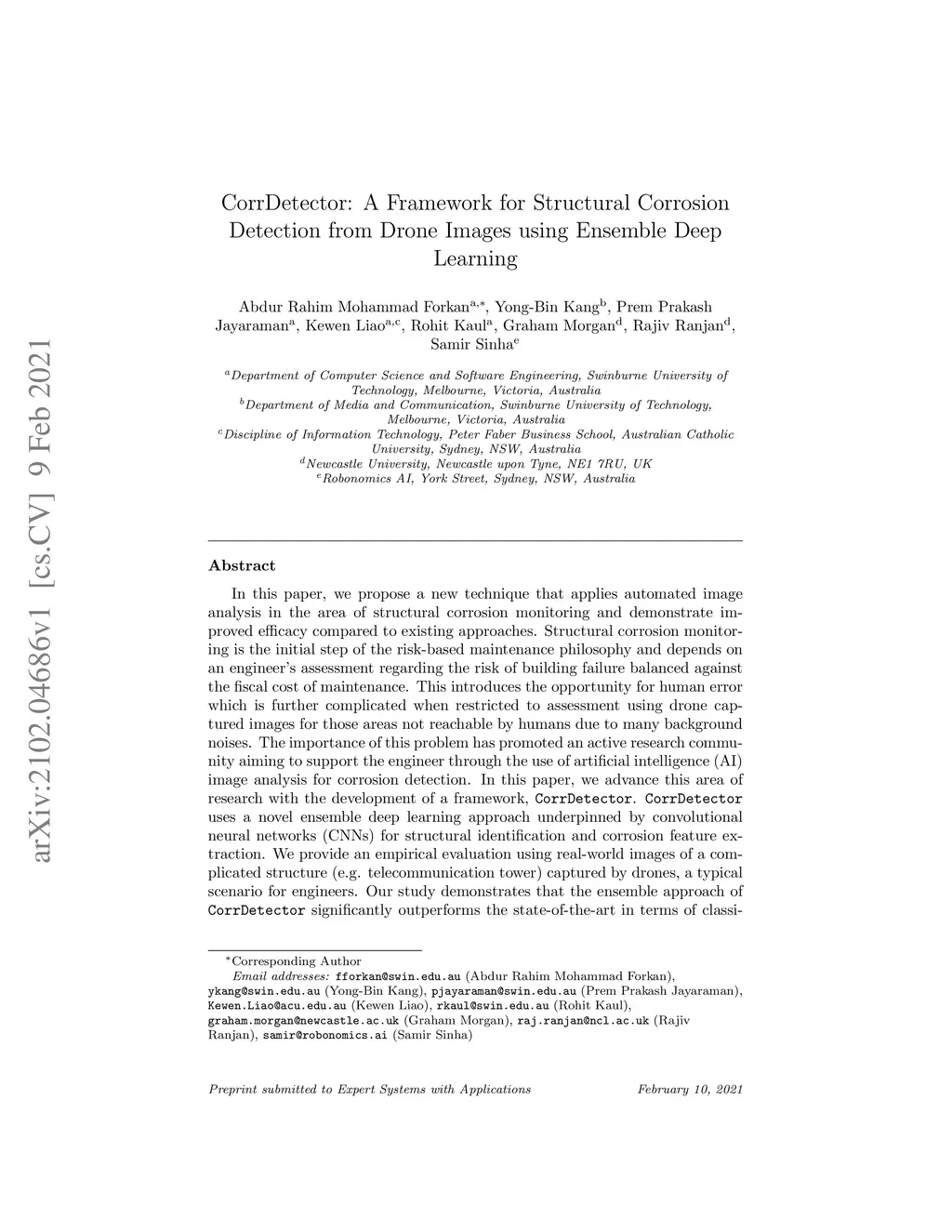 In this paper, we propose a new technique that applies automated image analysis in the area of structural corrosion monitoring and demonstrate improved efficacy compared to existing approaches. Structural corrosion monitoring is the initial step of the risk-based maintenance philosophy and depends on an engineer's assessment regarding the risk of building failure balanced against the fiscal cost of maintenance. This introduces the opportunity for human error which is further complicated when restricted to assessment using drone captured images for those areas not reachable by humans due to many background noises. The importance of this problem has promoted an active research community aiming to support the engineer through the use of artificial intelligence (AI) image analysis for corrosion detection. In this paper, we advance this area of research with the development of a framework, CorrDetector. CorrDetector uses a novel ensemble deep learning approach underpinned by convolutional neural networks (CNNs) for structural identification and corrosion feature extraction. We provide an empirical evaluation using real-world images of a complicated structure (e.g. telecommunication tower) captured by drones, a typical scenario for engineers. Our study demonstrates that the ensemble approach of \model significantly outperforms the state-of-the-art in terms of classification accuracy.