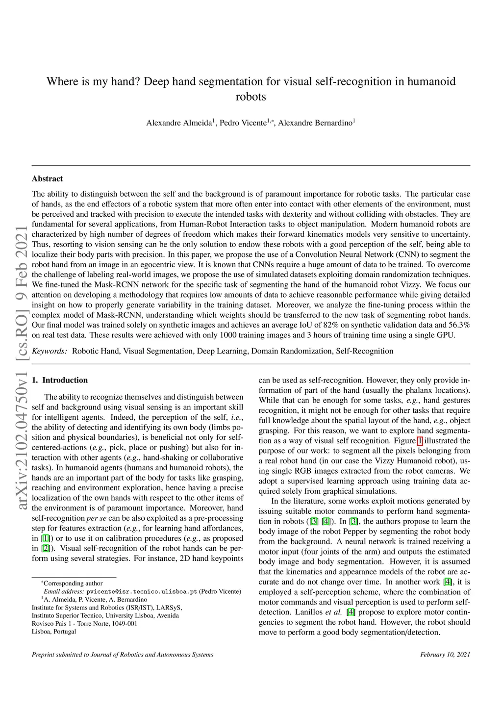 The ability to distinguish between the self and the background is of paramount importance for robotic tasks. The particular case of hands, as the end effectors of a robotic system that more often enter into contact with other elements of the environment, must be perceived and tracked with precision to execute the intended tasks with dexterity and without colliding with obstacles. They are fundamental for several applications, from Human-Robot Interaction tasks to object manipulation. Modern humanoid robots are characterized by high number of degrees of freedom which makes their forward kinematics models very sensitive to uncertainty. Thus, resorting to vision sensing can be the only solution to endow these robots with a good perception of the self, being able to localize their body parts with precision. In this paper, we propose the use of a Convolution Neural Network (CNN) to segment the robot hand from an image in an egocentric view. It is known that CNNs require a huge amount of data to be trained. To overcome the challenge of labeling real-world images, we propose the use of simulated datasets exploiting domain randomization techniques. We fine-tuned the Mask-RCNN network for the specific task of segmenting the hand of the humanoid robot Vizzy. We focus our attention on developing a methodology that requires low amounts of data to achieve reasonable performance while giving detailed insight on how to properly generate variability in the training dataset. Moreover, we analyze the fine-tuning process within the complex model of Mask-RCNN, understanding which weights should be transferred to the new task of segmenting robot hands. Our final model was trained solely on synthetic images and achieves an average IoU of 82% on synthetic validation data and 56.3% on real test data. These results were achieved with only 1000 training images and 3 hours of training time using a single GPU.