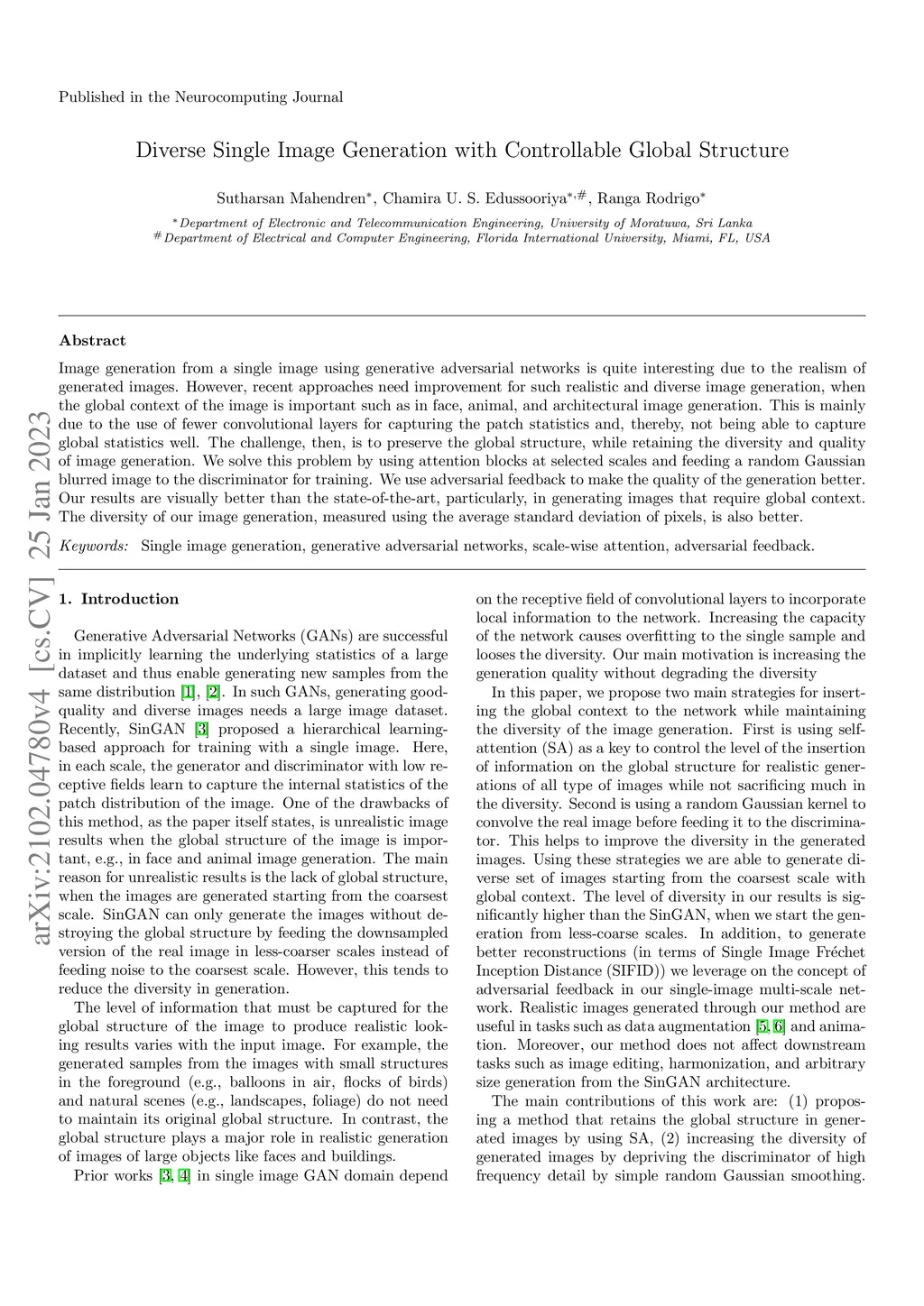 Image generation from a single image using generative adversarial networks is quite interesting due to the realism of generated images. However, recent approaches need improvement for such realistic and diverse image generation, when the global context of the image is important such as in face, animal, and architectural image generation. This is mainly due to the use of fewer convolutional layers for mainly capturing the patch statistics and, thereby, not being able to capture global statistics very well. We solve this problem by using attention blocks at selected scales and feeding a random Gaussian blurred image to the discriminator for training. Our results are visually better than the state-of-the-art particularly in generating images that require global context. The diversity of our image generation, measured using the average standard deviation of pixels, is also better.