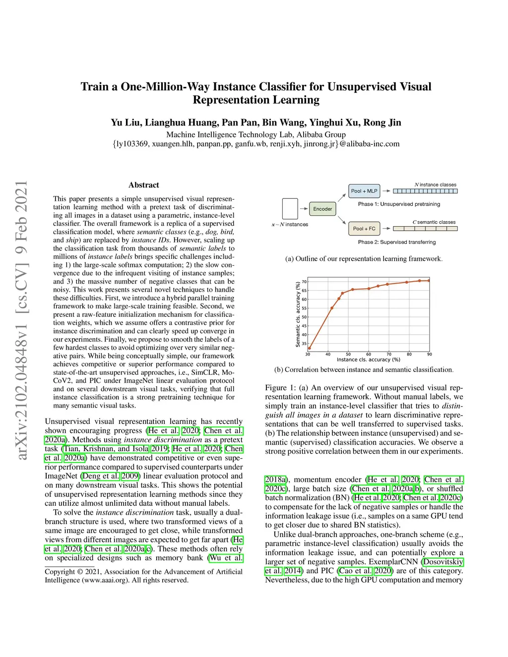 This paper presents a simple unsupervised visual representation learning method with a pretext task of discriminating all images in a dataset using a parametric, instance-level classifier. The overall framework is a replica of a supervised classification model, where semantic classes (e.g., dog, bird, and ship) are replaced by instance IDs. However, scaling up the classification task from thousands of semantic labels to millions of instance labels brings specific challenges including 1) the large-scale softmax computation; 2) the slow convergence due to the infrequent visiting of instance samples; and 3) the massive number of negative classes that can be noisy. This work presents several novel techniques to handle these difficulties. First, we introduce a hybrid parallel training framework to make large-scale training feasible. Second, we present a raw-feature initialization mechanism for classification weights, which we assume offers a contrastive prior for instance discrimination and can clearly speed up converge in our experiments. Finally, we propose to smooth the labels of a few hardest classes to avoid optimizing over very similar negative pairs. While being conceptually simple, our framework achieves competitive or superior performance compared to state-of-the-art unsupervised approaches, i.e., SimCLR, MoCoV2, and PIC under ImageNet linear evaluation protocol and on several downstream visual tasks, verifying that full instance classification is a strong pretraining technique for many semantic visual tasks.