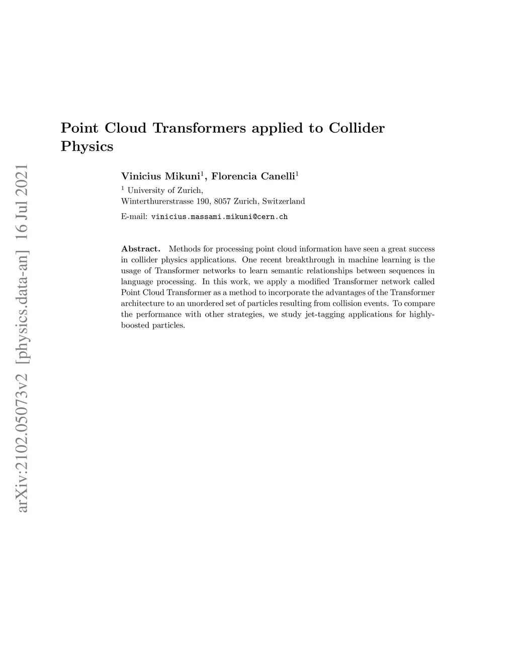 Methods for processing point cloud information have seen a great success in collider physics applications. One recent breakthrough in machine learning is the usage of Transformer networks to learn semantic relationships between sequences in language processing. In this work, we apply a modified Transformer network called Point Cloud Transformer as a method to incorporate the advantages of the Transformer architecture to an unordered set of particles resulting from collision events. To compare the performance with other strategies, we study jet-tagging applications for highly-boosted particles.
