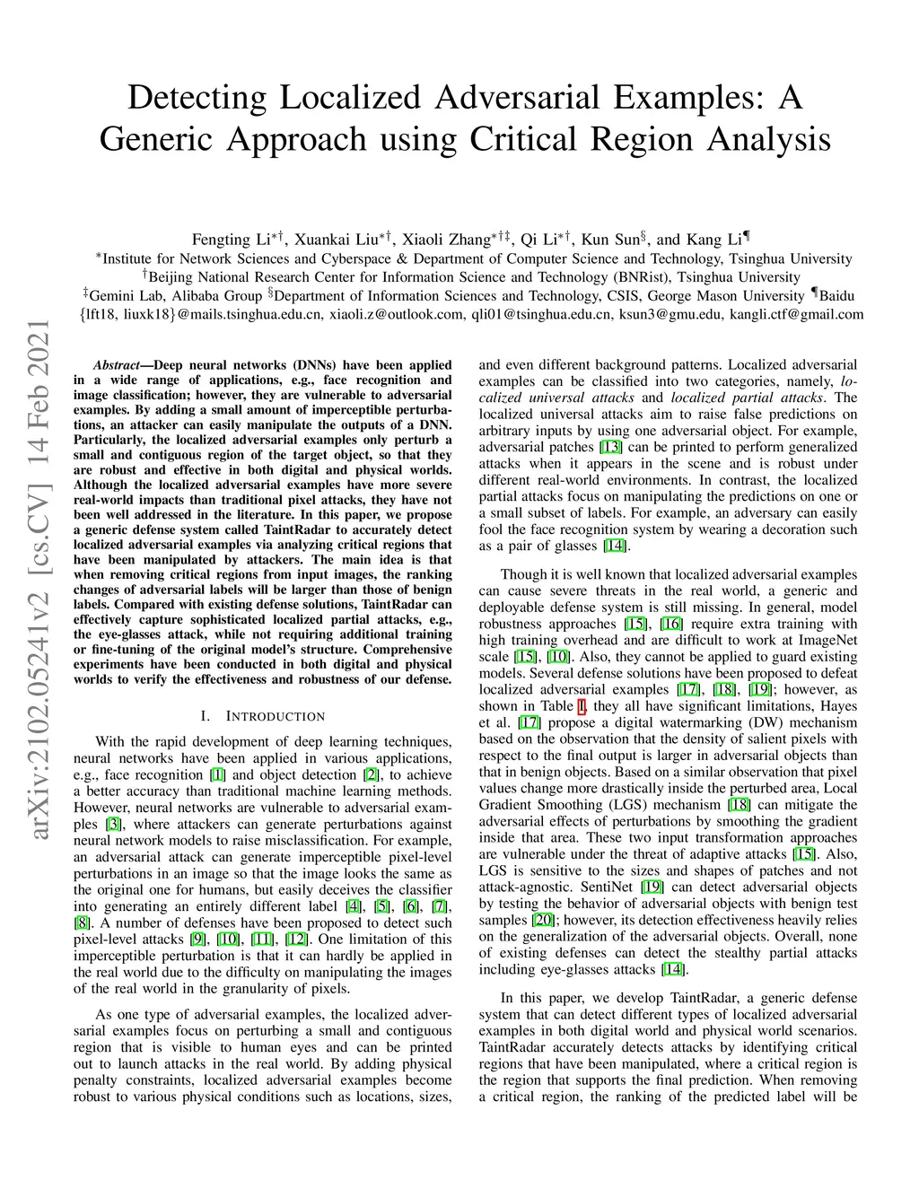 Deep neural networks (DNNs) have been applied in a wide range of applications,e.g.,face recognition and image classification; however,they are vulnerable to adversarial examples. By adding a small amount of imperceptible perturbations,an attacker can easily manipulate the outputs of a DNN. Particularly,the localized adversarial examples only perturb a small and contiguous region of the target object,so that they are robust and effective in both digital and physical worlds. Although the localized adversarial examples have more severe real-world impacts than traditional pixel attacks,they have not been well addressed in the literature. In this paper,we propose a generic defense system called TaintRadar to accurately detect localized adversarial examples via analyzing critical regions that have been manipulated by attackers. The main idea is that when removing critical regions from input images,the ranking changes of adversarial labels will be larger than those of benign labels. Compared with existing defense solutions,TaintRadar can effectively capture sophisticated localized partial attacks, e.g.,the eye-glasses attack,while not requiring additional training or fine-tuning of the original model's structure. Comprehensive experiments have been conducted in both digital and physical worlds to verify the effectiveness and robustness of our defense.