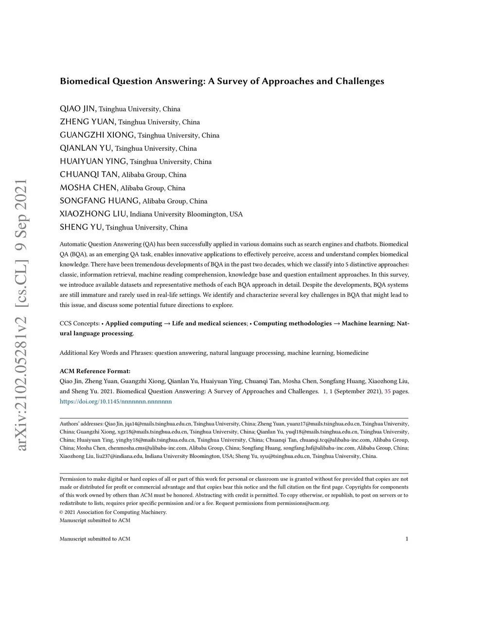 Automatic Question Answering (QA) has been successfully applied in various domains such as search engines and chatbots. Biomedical QA (BQA), as an emerging QA task, enables innovative applications to effectively perceive, access and understand complex biomedical knowledge. There have been tremendous developments of BQA in the past two decades, which we classify into 5 distinctive approaches: classic, information retrieval, machine reading comprehension, knowledge base and question entailment approaches. In this survey, we introduce available datasets and representative methods of each BQA approach in detail. Despite the developments, BQA systems are still immature and rarely used in real-life settings. We identify and characterize several key challenges in BQA that might lead to this issue, and discuss some potential future directions to explore.