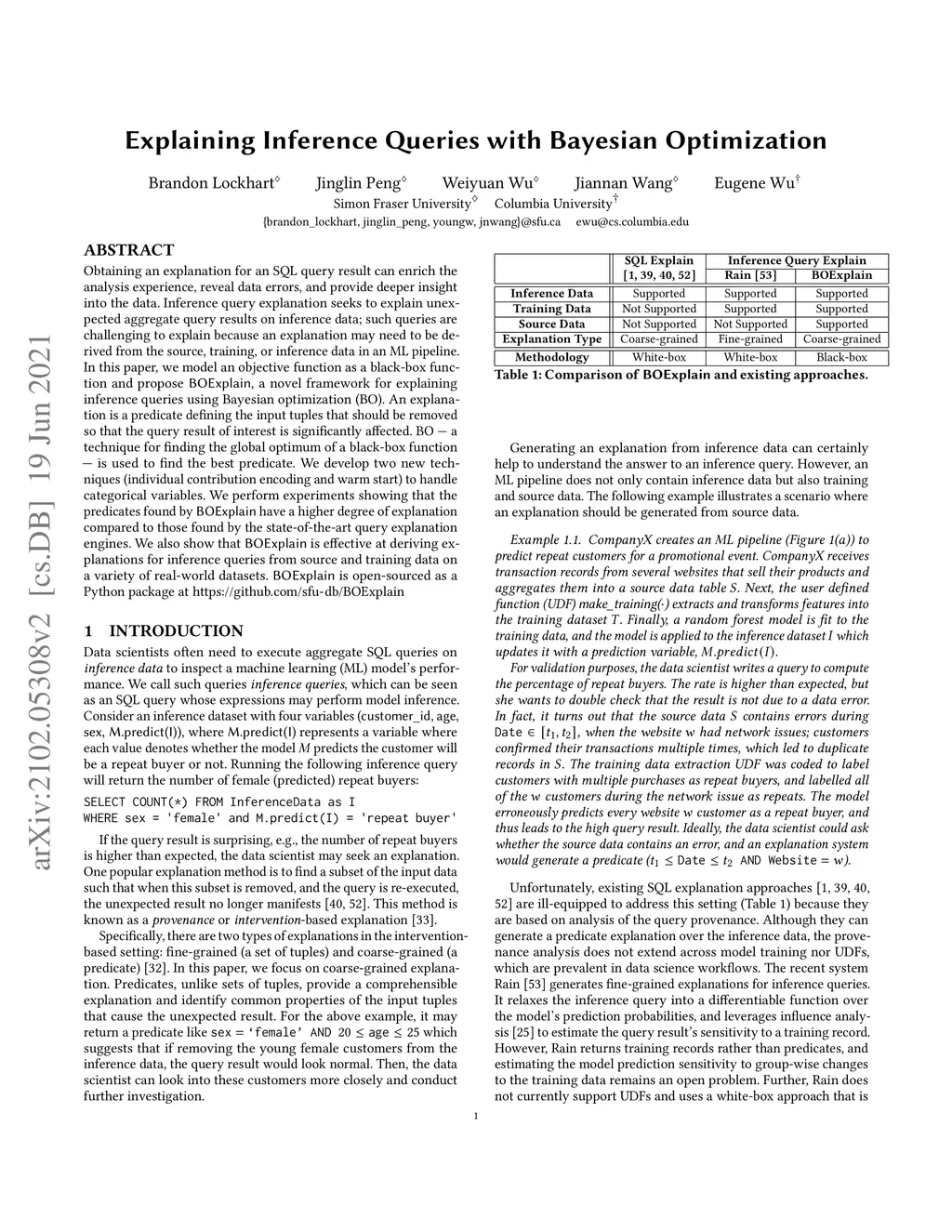 Obtaining an explanation for an SQL query result can enrich the analysis experience, reveal data errors, and provide deeper insight into the data. Inference query explanation seeks to explain unexpected aggregate query results on inference data; such queries are challenging to explain because an explanation may need to be derived from the source, training, or inference data in an ML pipeline. In this paper, we model an objective function as a black-box function and propose BOExplain, a novel framework for explaining inference queries using Bayesian optimization (BO). An explanation is a predicate defining the input tuples that should be removed so that the query result of interest is significantly affected. BO - a technique for finding the global optimum of a black-box function - is used to find the best predicate. We develop two new techniques (individual contribution encoding and warm start) to handle categorical variables. We perform experiments showing that the predicates found by BOExplain have a higher degree of explanation compared to those found by the state-of-the-art query explanation engines. We also show that BOExplain is effective at deriving explanations for inference queries from source and training data on a variety of real-world datasets. BOExplain is open-sourced as a Python package at https://github.com/sfu-db/BOExplain.