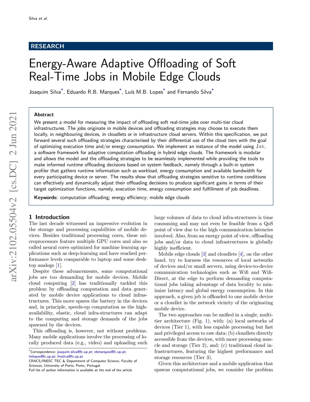 We present a model for measuring the impact of offloading soft real-time jobs over multi-tier cloud infrastructures. The jobs originate in mobile devices and offloading strategies may choose to execute them locally, in neighbouring devices, in cloudlets or in infrastructure cloud servers. Within this specification, we put forward several such offloading strategies characterised by their differential use of the cloud tiers with the goal of optimizing execution time and/or energy consumption. We implement an instance of the model using Jay, a software framework for adaptive computation offloading in hybrid edge clouds. The framework is modular and allows the model and the offloading strategies to be seamlessly implemented while providing the tools to make informed runtime offloading decisions based on system feedback, namely through a built-in system profiler that gathers runtime information such as workload, energy consumption and available bandwidth for every participating device or server. The results show that offloading strategies sensitive to runtime conditions can effectively and dynamically adjust their offloading decisions to produce significant gains in terms of their target optimization functions, namely, execution time, energy consumption and fulfillment of job deadlines.