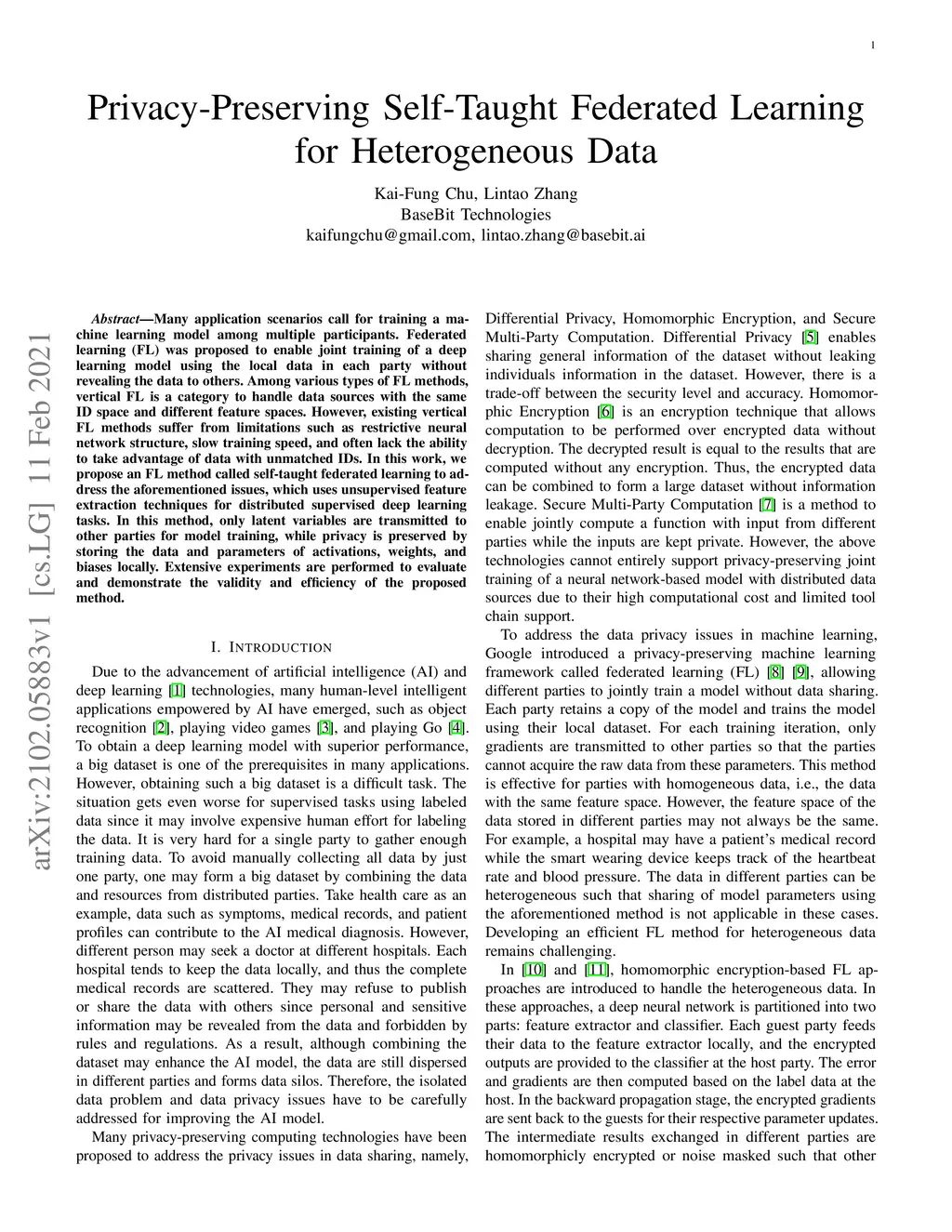 Many application scenarios call for training a machine learning model among multiple participants. Federated learning (FL) was proposed to enable joint training of a deep learning model using the local data in each party without revealing the data to others. Among various types of FL methods, vertical FL is a category to handle data sources with the same ID space and different feature spaces. However, existing vertical FL methods suffer from limitations such as restrictive neural network structure, slow training speed, and often lack the ability to take advantage of data with unmatched IDs. In this work, we propose an FL method called self-taught federated learning to address the aforementioned issues, which uses unsupervised feature extraction techniques for distributed supervised deep learning tasks. In this method, only latent variables are transmitted to other parties for model training, while privacy is preserved by storing the data and parameters of activations, weights, and biases locally. Extensive experiments are performed to evaluate and demonstrate the validity and efficiency of the proposed method.