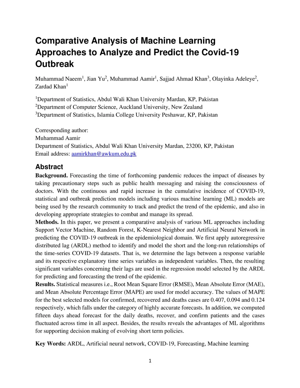 Background. Forecasting the time of forthcoming pandemic reduces the impact of diseases by taking precautionary steps such as public health messaging and raising the consciousness of doctors. With the continuous and rapid increase in the cumulative incidence of COVID-19, statistical and outbreak prediction models including various machine learning (ML) models are being used by the research community to track and predict the trend of the epidemic, and also in developing appropriate strategies to combat and manage its spread. Methods. In this paper, we present a comparative analysis of various ML approaches including Support Vector Machine, Random Forest, K-Nearest Neighbor and Artificial Neural Network in predicting the COVID-19 outbreak in the epidemiological domain. We first apply the autoregressive distributed lag (ARDL) method to identify and model the short and long-run relationships of the time-series COVID-19 datasets. That is, we determine the lags between a response variable and its respective explanatory time series variables as independent variables. Then, the resulting significant variables concerning their lags are used in the regression model selected by the ARDL for predicting and forecasting the trend of the epidemic. Results. Statistical measures i.e., Root Mean Square Error (RMSE), Mean Absolute Error (MAE) and Mean Absolute Percentage Error (MAPE) are used for model accuracy. The values of MAPE for the best selected models for confirmed, recovered and deaths cases are 0.407, 0.094 and 0.124 respectively, which falls under the category of highly accurate forecasts. In addition, we computed fifteen days ahead forecast for the daily deaths, recover, and confirm patients and the cases fluctuated across time in all aspects. Besides, the results reveal the advantages of ML algorithms for supporting decision making of evolving short term policies.
