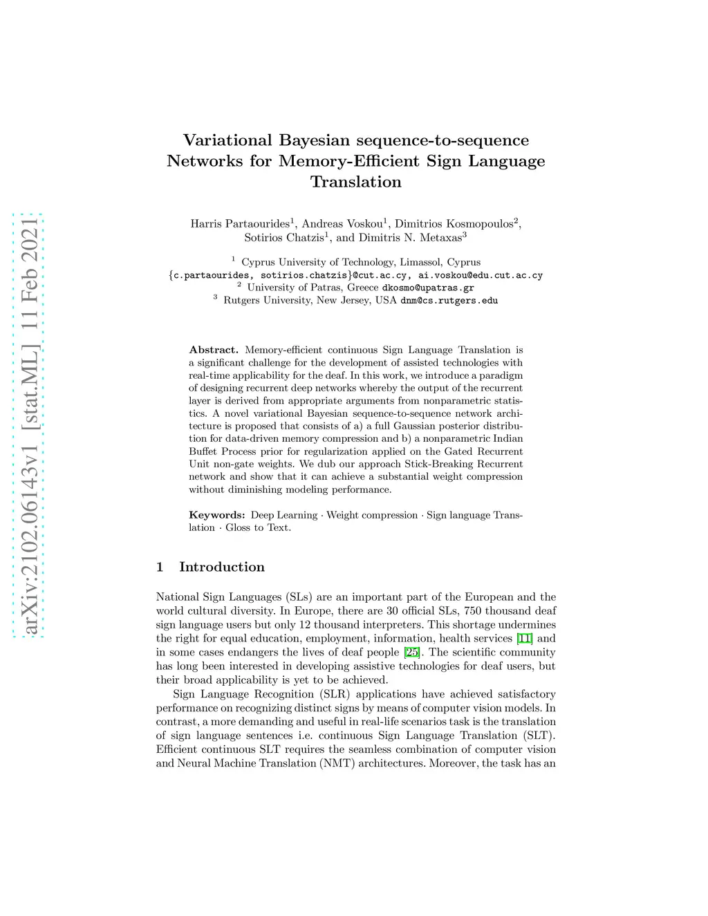 Memory-efficient continuous Sign Language Translation is a significant challenge for the development of assisted technologies with real-time applicability for the deaf. In this work, we introduce a paradigm of designing recurrent deep networks whereby the output of the recurrent layer is derived from appropriate arguments from nonparametric statistics. A novel variational Bayesian sequence-to-sequence network architecture is proposed that consists of a) a full Gaussian posterior distribution for data-driven memory compression and b) a nonparametric Indian Buffet Process prior for regularization applied on the Gated Recurrent Unit non-gate weights. We dub our approach Stick-Breaking Recurrent network and show that it can achieve a substantial weight compression without diminishing modeling performance.