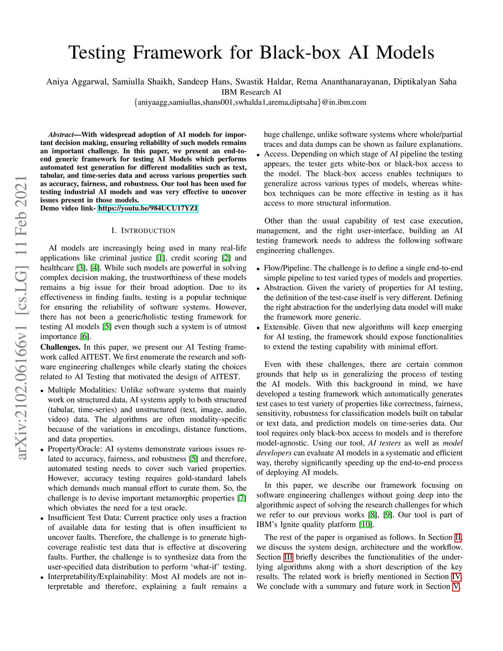 With widespread adoption of AI models for important decision making, ensuring reliability of such models remains an important challenge. In this paper, we present an end-to-end generic framework for testing AI Models which performs automated test generation for different modalities such as text, tabular, and time-series data and across various properties such as accuracy, fairness, and robustness. Our tool has been used for testing industrial AI models and was very effective to uncover issues present in those models. Demo video link: https://youtu.be/984UCU17YZI