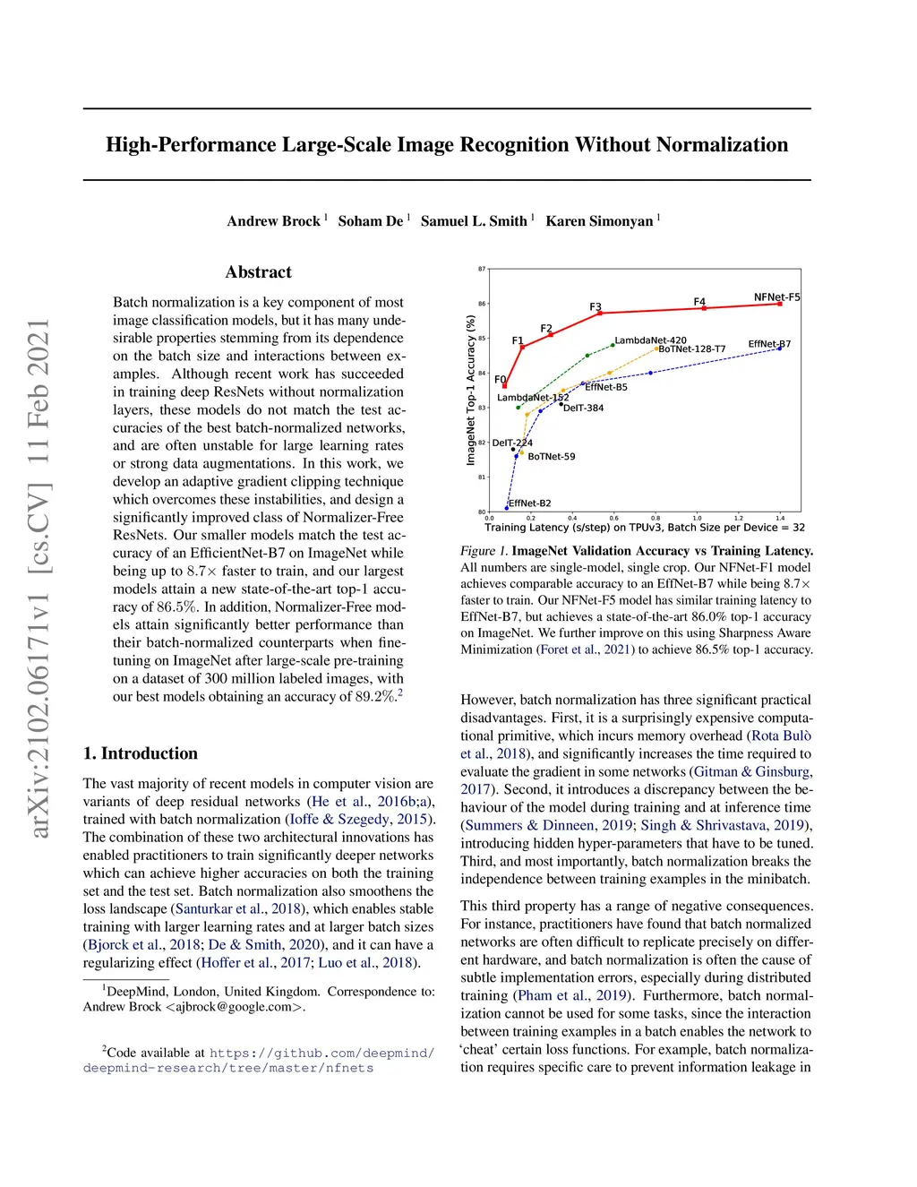 Batch normalization is a key component of most image classification models, but it has many undesirable properties stemming from its dependence on the batch size and interactions between examples. Although recent work has succeeded in training deep ResNets without normalization layers, these models do not match the test accuracies of the best batch-normalized networks, and are often unstable for large learning rates or strong data augmentations. In this work, we develop an adaptive gradient clipping technique which overcomes these instabilities, and design a significantly improved class of Normalizer-Free ResNets. Our smaller models match the test accuracy of an EfficientNet-B7 on ImageNet while being up to 8.7x faster to train, and our largest models attain a new state-of-the-art top-1 accuracy of 86.5%. In addition, Normalizer-Free models attain significantly better performance than their batch-normalized counterparts when finetuning on ImageNet after large-scale pre-training on a dataset of 300 million labeled images, with our best models obtaining an accuracy of 89.2%. Our code is available at https://github.com/deepmind/ deepmind-research/tree/master/nfnets