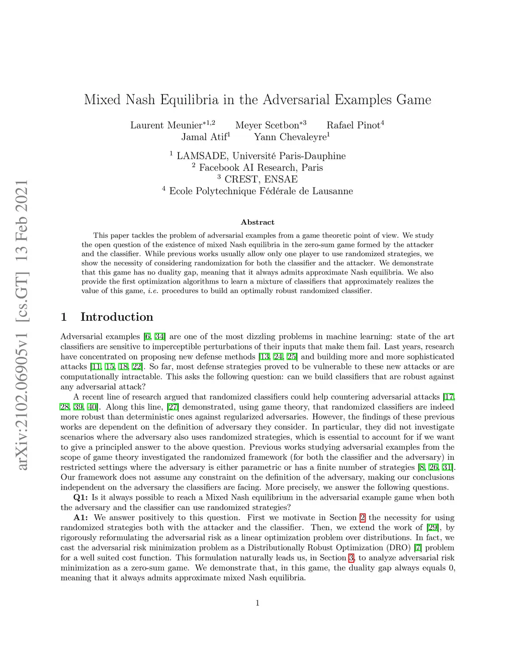 Mixed Nash Equilibria in the Adversarial Examples Game