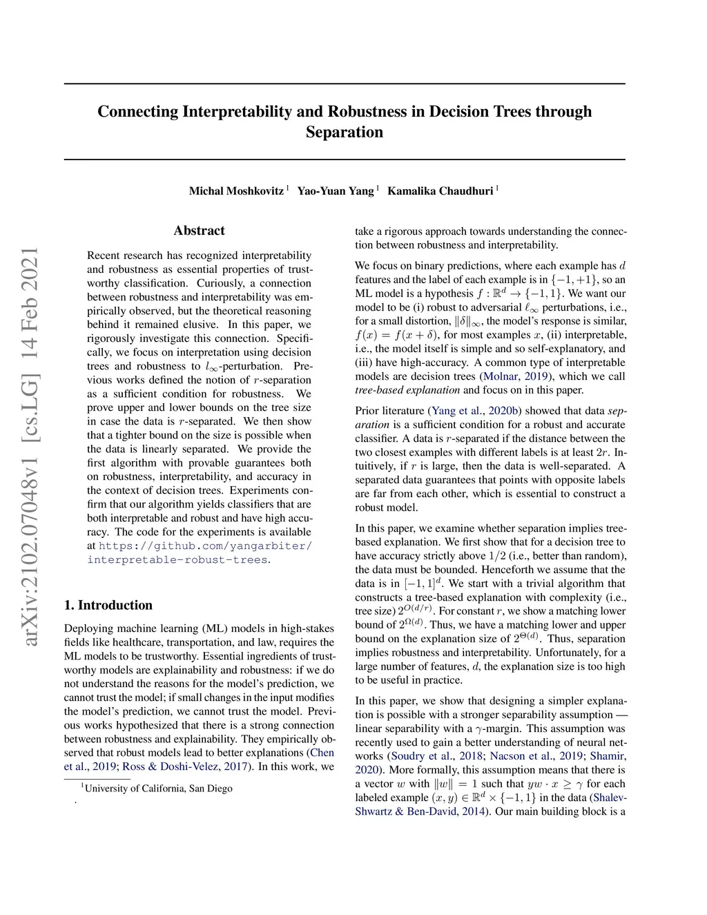 Recent research has recognized interpretability and robustness as essential properties of trustworthy classification. Curiously, a connection between robustness and interpretability was empirically observed, but the theoretical reasoning behind it remained elusive. In this paper, we rigorously investigate this connection. Specifically, we focus on interpretation using decision trees and robustness to -perturbation. Previous works defined the notion of -separation as a sufficient condition for robustness. We prove upper and lower bounds on the tree size in case the data is -separated. We then show that a tighter bound on the size is possible when the data is linearly separated. We provide the first algorithm with provable guarantees both on robustness, interpretability, and accuracy in the context of decision trees. Experiments confirm that our algorithm yields classifiers that are both interpretable and robust and have high accuracy. The code for the experiments is available at https://github.com/yangarbiter/interpretable-robust-trees .