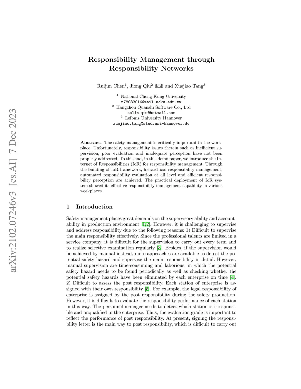 The safety management is critically important in the workplace. Unfortunately, responsibility issues therein such as inefficient supervision, poor evaluation and inadequate perception have not been properly addressed. To this end, in this paper, we deploy the Internet of Responsibilities (IoR) for responsibility management. Through the building of IoR framework, hierarchical responsibility management, automated responsibility evaluation at all level and efficient responsibility perception are achieved. The practical deployment of IoR system showed its effective responsibility management capability in various workplaces.