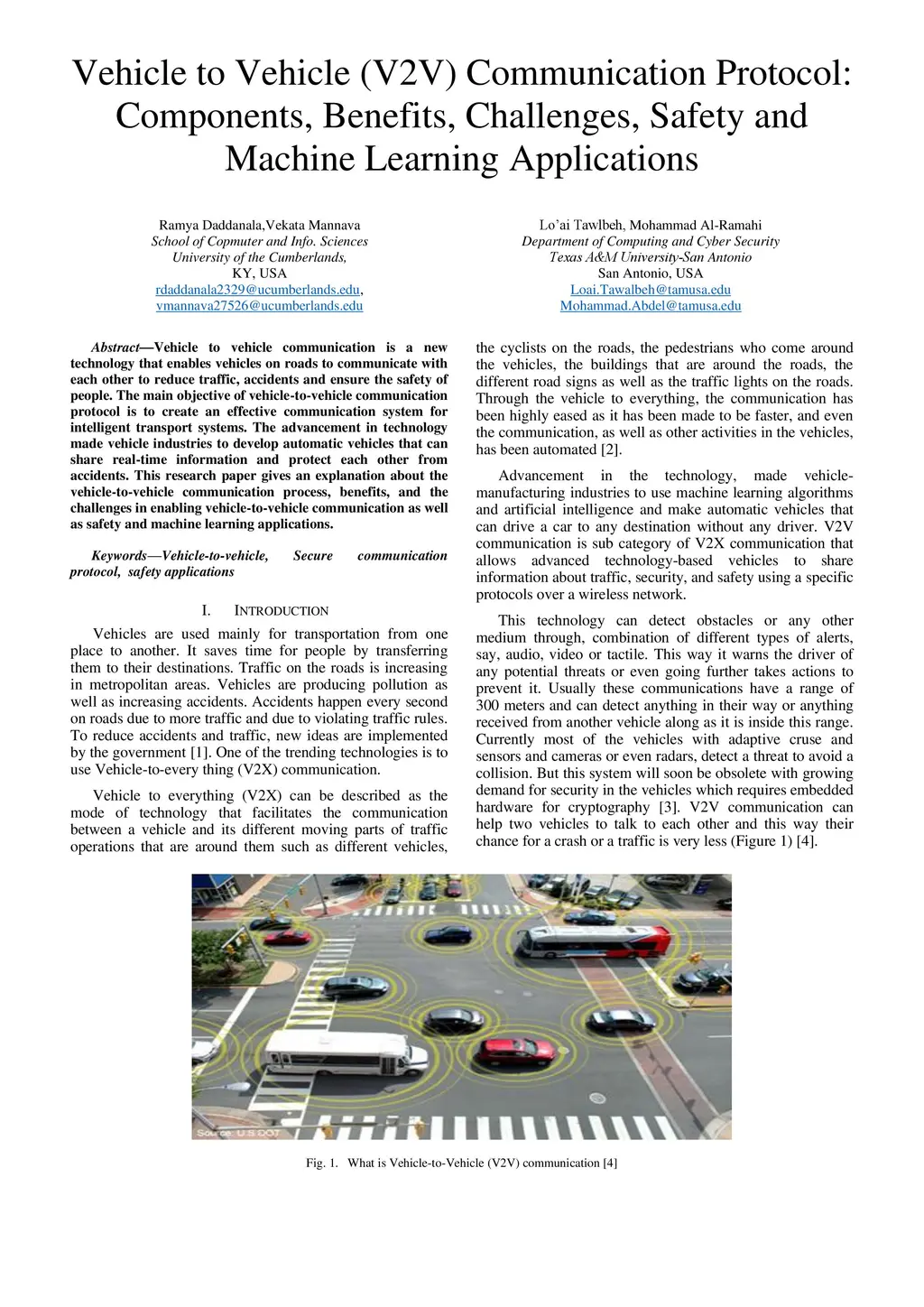 Vehicle to vehicle communication is a new technology that enables vehicles on roads to communicate with each other to reduce traffic, accidents and ensure the safety of people. The main objective of vehicle-to-vehicle communication protocol is to create an effective communication system for intelligent transport systems. The advancement in technology made vehicle industries to develop automatic vehicles that can share real-time information and protect each other from accidents. This research paper gives an explanation about the vehicle-to-vehicle communication process, benefits, and the challenges in enabling vehicle-to-vehicle communication as well as safety and machine learning applications.