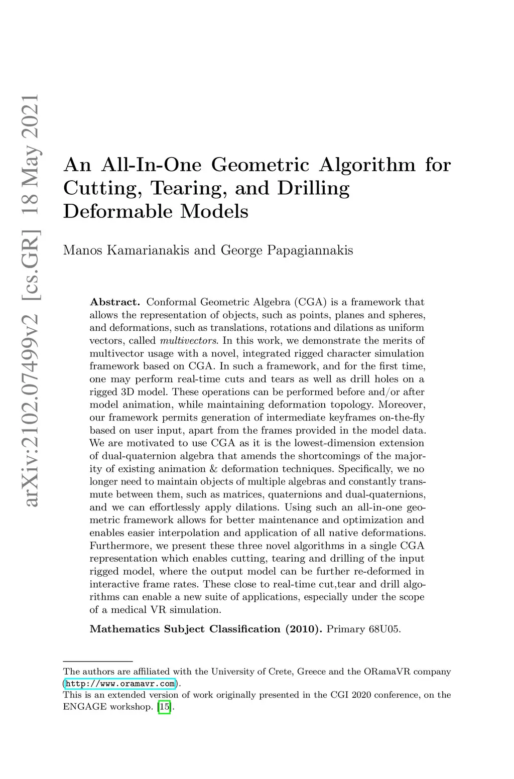 Conformal Geometric Algebra (CGA) is a framework that allows the representation of objects, such as points, planes and spheres, and deformations, such as translations, rotations and dilations as uniform vectors, called multivectors. In this work, we demonstrate the merits of multivector usage with a novel, integrated rigged character simulation framework based on CGA. In such a framework, and for the first time, one may perform real-time cuts and tears as well as drill holes on a rigged 3D model. These operations can be performed before and/or after model animation, while maintaining deformation topology. Moreover, our framework permits generation of intermediate keyframes on-the-fly based on user input, apart from the frames provided in the model data. We are motivated to use CGA as it is the lowest-dimension extension of dual-quaternion algebra that amends the shortcomings of the majority of existing animation and deformation techniques. Specifically, we no longer need to maintain objects of multiple algebras and constantly transmute between them, such as matrices, quaternions and dual-quaternions, and we can effortlessly apply dilations. Using such an all-in-one geometric framework allows for better maintenance and optimization and enables easier interpolation and application of all native deformations. Furthermore, we present these three novel algorithms in a single CGA representation which enables cutting, tearing and drilling of the input rigged model, where the output model can be further re-deformed in interactive frame rates. These close to real-time cut,tear and drill algorithms can enable a new suite of applications, especially under the scope of a medical VR simulation.