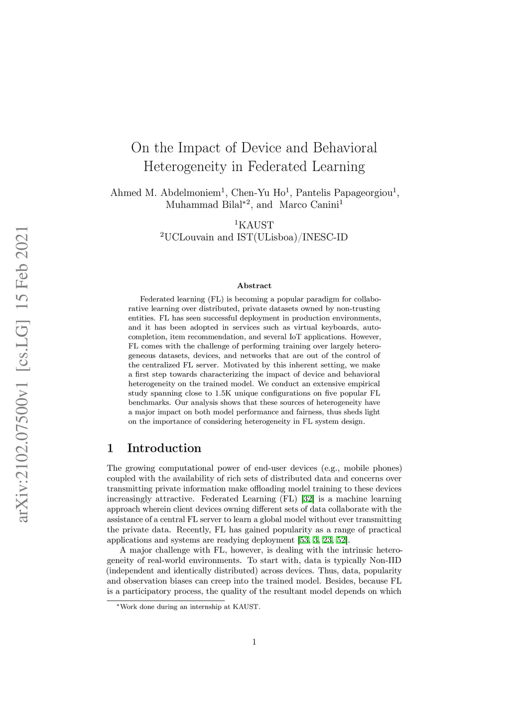 Federated learning (FL) is becoming a popular paradigm for collaborative learning over distributed, private datasets owned by non-trusting entities. FL has seen successful deployment in production environments, and it has been adopted in services such as virtual keyboards, auto-completion, item recommendation, and several IoT applications. However, FL comes with the challenge of performing training over largely heterogeneous datasets, devices, and networks that are out of the control of the centralized FL server. Motivated by this inherent setting, we make a first step towards characterizing the impact of device and behavioral heterogeneity on the trained model. We conduct an extensive empirical study spanning close to 1.5K unique configurations on five popular FL benchmarks. Our analysis shows that these sources of heterogeneity have a major impact on both model performance and fairness, thus sheds light on the importance of considering heterogeneity in FL system design.