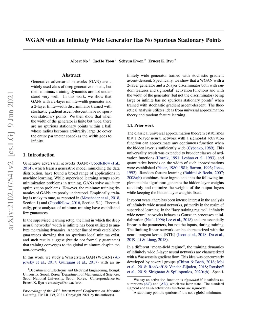 Generative adversarial networks (GAN) are a widely used class of deep generative models, but their minimax training dynamics are not understood very well. In this work, we show that GANs with a 2-layer infinite-width generator and a 2-layer finite-width discriminator trained with stochastic gradient ascent-descent have no spurious stationary points. We then show that when the width of the generator is finite but wide, there are no spurious stationary points within a ball whose radius becomes arbitrarily large (to cover the entire parameter space) as the width goes to infinity.