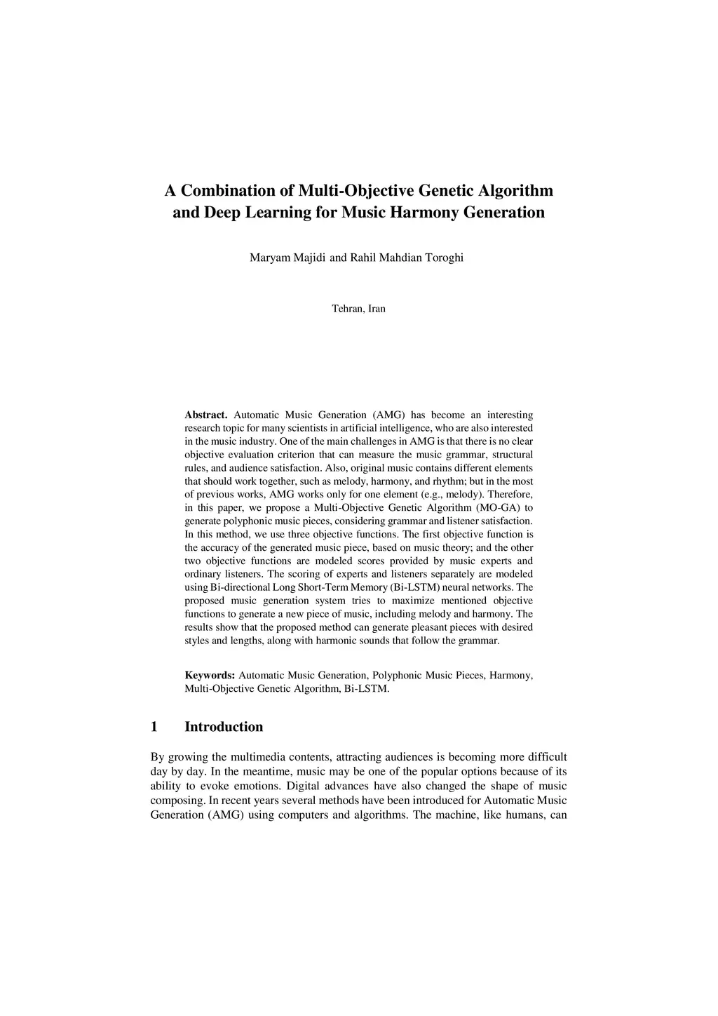 Automatic Music Generation (AMG) has become an interesting research topic for many scientists in artificial intelligence, who are also interested in the music industry. One of the main challenges in AMG is that there is no clear objective evaluation criterion that can measure the music grammar, structural rules, and audience satisfaction. Also, original music contains different elements that should work together, such as melody, harmony, and rhythm; but in the most of previous works, AMG works only for one element (e.g., melody). Therefore, in this paper, we propose a Multi-Objective Genetic Algorithm (MO-GA) to generate polyphonic music pieces, considering grammar and listener satisfaction. In this method, we use three objective functions. The first objective function is the accuracy of the generated music piece, based on music theory; and the other two objective functions are modeled scores provided by music experts and ordinary listeners. The scoring of experts and listeners separately are modeled using Bi-directional Long Short-Term Memory (Bi-LSTM) neural networks. The proposed music generation system tries to maximize mentioned objective functions to generate a new piece of music, including melody and harmony. The results show that the proposed method can generate pleasant pieces with desired styles and lengths, along with harmonic sounds that follow the grammar.